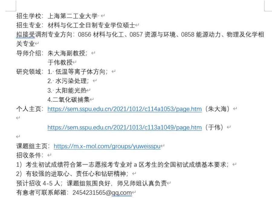 上海第二工业大学材料与化工专业于伟教授课题组招收调剂,工科相关优先 发自小木虫手机客户端 |