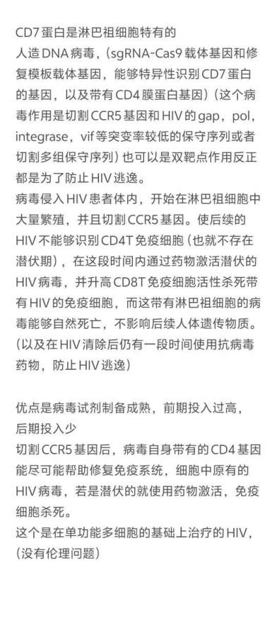 CD7蛋白是淋巴祖细胞特有的 人造DNA病毒,(sgRNA-Cas9载体基因和修复模板载体基因,能够特异性识别CD7蛋白的基因,以及带有CD4膜蛋白基因)(这个病毒作用是切割CCR5基因和HIV的gap,pol,integrase,vif等突变率较低的保守序列或者切割多组保守序列)也可以是双靶点作用反正都是为了防止HIV逃逸。 病毒侵入HIV患者体内,开始在淋巴祖细胞中大量繁殖,并且切割CCR5基因。使后续的HIV不能够识别CD4T免疫细胞(也就不存在潜伏期),在这段时间内通过药物激活潜伏的HIV病毒,并升高CD8T免疫细胞活性杀死带有HIV的免疫细胞,而这带有淋巴祖细胞的病毒能够自然死亡,不影响后续人体遗传物质。(以及在HIV清除后仍有一段时间使用抗病毒药物,防止HIV逃逸) 优点是病毒试剂制备成熟,前期投入过高, 后期投入少 切割CCR5基因后,病毒自身带有的CD4基因能尽可能帮助修复免疫系统,细胞中原有的HIV病毒,若是潜伏的就使用药物激活,免疫细胞杀死。 这个是在单功能多细胞的基础上治疗的HIV,(没有伦理问题) 发自小木虫手机客户端 |