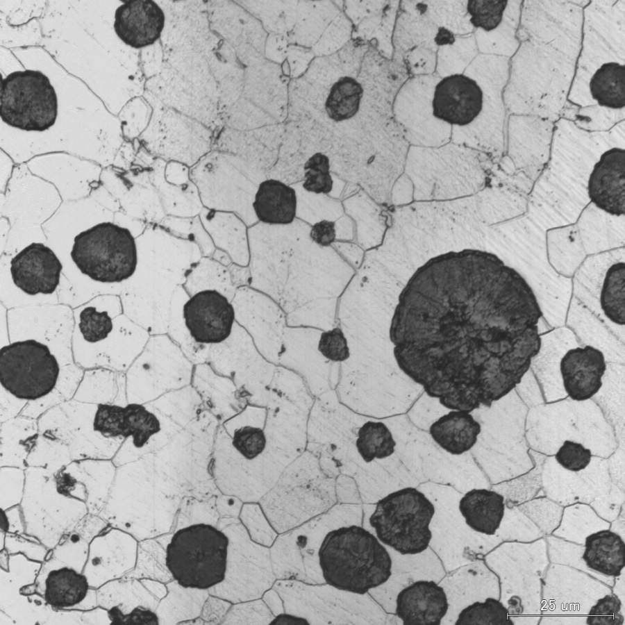 其中形核是石墨的首要过程,铁液在熔炼及随后的球化、孕育处理中会产生大量的非金属夹杂物,这些非金属夹杂物的形状大小和沉浮状态,成为石墨析出的核心,形核后碳原子开始在这些核心上不断堆砌叠加。