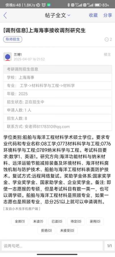 上海海事大学船舶与海洋工程材料招收调剂,有意向的同学可以浏览上海海事大学研究生招生网,上海海事大学海洋科学与工程学院官网及公众号。 发自小木虫手机客户端 |