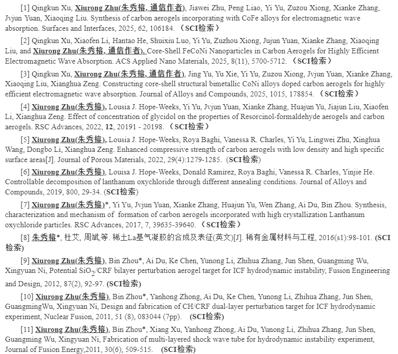 系统开放时间下午3点到明天上午9点,同学们加油!联系方式:zxr20786@qq.com 要求:一志愿报考代码080900、087400、080501、080400、080800、081000、085401、085403、085407、085408、085409 1.jpg 研究方向: (1)高性能电磁波、微波吸收材料与损耗机制的研究; (2)柔性电子与器件相关材料的应用研究; (3)超低密度纳米多孔材料(稀土基气凝胶、二氧化硅气凝胶、碳气凝胶)、生物质碳材料的研究,并探究其在锂离子电池电极、保温隔热、环境处理等领域的应用。 朱秀榕,博士、教授,江西赣县人,电子科学与技术、电子信息和学科教学(物理)硕士点导师。2012年博士毕业于同济大学物理科学与工程学院凝聚态物理专业,2017年获国家留学基金委的资助(公派访问学者)前往美国texas tech university进行学术交流。申请并获批国家自然科学基金项目两项、江西省自然科学基金面上项目一项、江西省教育厅科技项目两项和上海市特殊人工微结构与技术重点实验室开放课题两项。研究成果在nuclear fusion、journal of alloys and compounds、acs applied nano materials、surfaces and interfaces、fusion engineering and design、journal of fusion energy、rare metal materials and engineering、journal of porous materials、rsc advances、journal of luminescence、microporous and mesoporous materials、journal of sol-gel science and technology、强激光与粒子束、物理化学学报和原子能科学与技术等sci、ei源刊上发表论文30多篇。 主要工作业绩: [1]江西省自然科学基金面上项目,稀土元素掺杂生物质炭材料的新合成机制与吸附、电化学性能研究,202301-202512,主持,在研; [2]江西省教育厅-自然科学项目,稀土氧化物掺杂生物质碳材料的制备与性能研究,202301-202512,主持,在研; [3]国家自然科学基金-青年科学基金项目,纳米多孔稀土基气凝胶的合成、凝胶化机理和功能化设计(51302040),2013.01-2016.12,主持,已结题; [4]国家自然科学基金-地区科学基金项目,环氧化物共凝胶法合成稀土氧化物掺杂碳气凝胶的研究(51762003),2018.01-2021.12,主持,已结题; [5]江西省教育厅-青年科学基金,纳米多孔碳气凝胶薄片和微柱的研究与应用(gjj13652),2013.01-2014.05,主持,已结题; [6]江西省教育厅-自然科学项目,低密度稀土la和y基气凝胶的合成与其溶胶-凝胶机理研究(gjj160940),2017.01-2018.12,主持,已结题; [7]上海市特殊人工微结构材料与技术重点实验室-开放课题,微尺寸碳气凝胶的研制及其应用(ammt2013a-4),2013.04-2015.03,主持,已结题; [8]上海市特殊人工微结构材料与技术重点实验室-开放课题,稀土基气凝胶的研究(ammt2017a-8),2017.04-2019.03,主持,已结题; [9]赣南师范大学首届校级“课程思政”示范课程,《自然科学概论》课程,2019.11-2021.11,主持,已结题; [10]江西省教育厅基础研究重点课题,渗透stse教育理念的高中物理教学实践及效果研究,2023.01-2025.12,主持在研。 代表性论文: 2.jpg |
