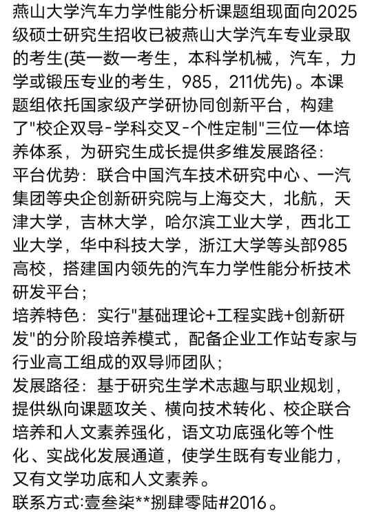 燕山大学汽车力学性能分析课题组招收已被燕大录取的汽车工程专业的考生
