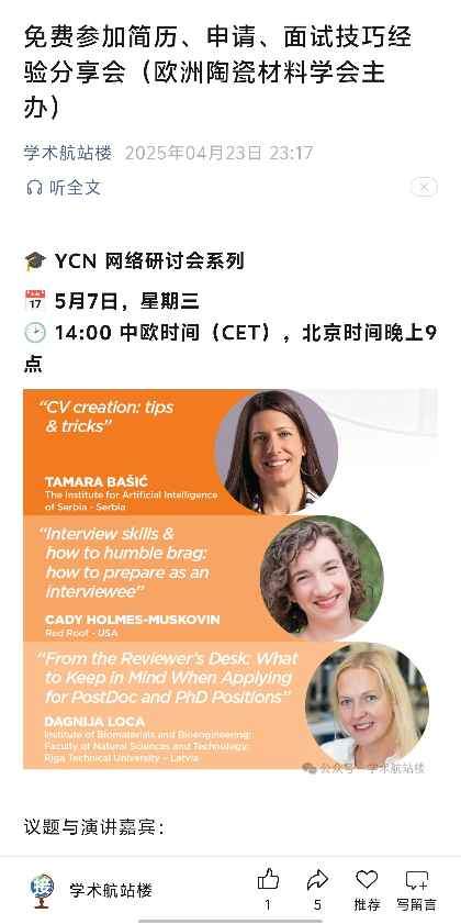 有一个免费参加的博士博后申请经验分享,英文的,说不定对大家有帮助,尤其是想出国的。内容好像啥都有,反正免费参加。
