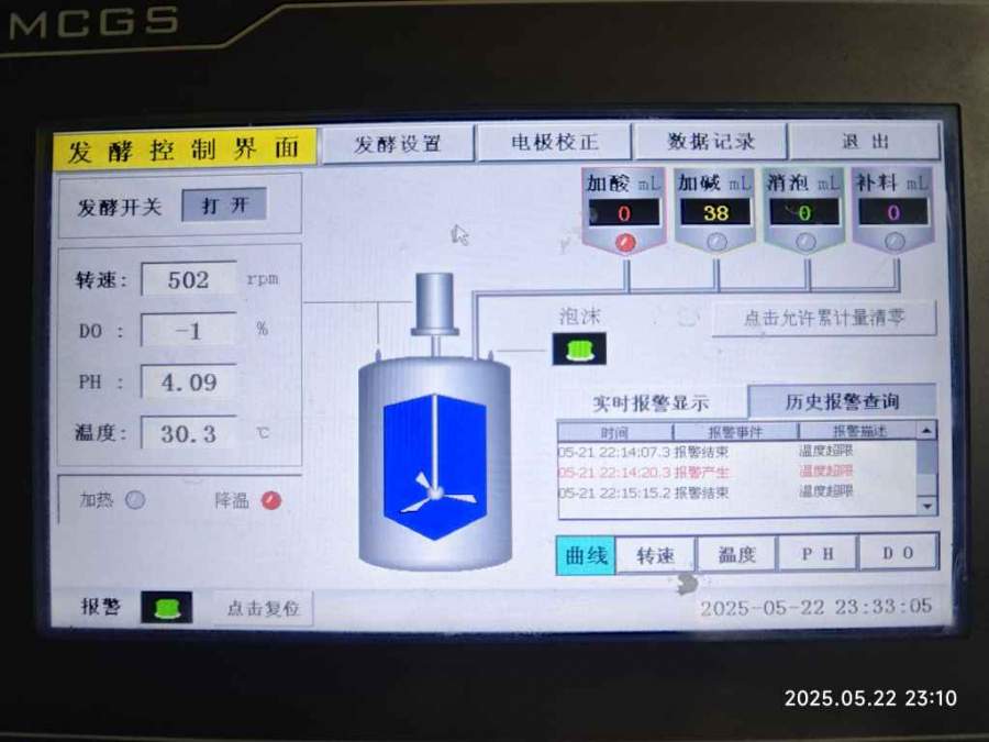 | 1、重新校准DO电极,确认校准液浓度和操作步骤正确;2、检查电极是否被泡沫、菌体或代谢产物污染,清洁或更换电极;3、若通入纯氧时溶氧仍无变化,可能电极已损坏;4、提高通气量(如1.5-2.0 vvm)或罐压(0.05-0.1 MPa);5、若设备允许,通入纯氧或氧气-空气混合气(比例1:1),条件允许下,提高转速,注意添加消泡剂;甘油消耗缓慢:1、更换新鲜菌种或复壮菌株;2、调节pH至5.0-5.5(毕赤酵母最适pH),必要时流加氨水或硫酸;3、维持温度稳定(30±0.5℃),避免高温抑制代谢; |