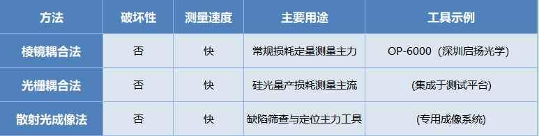 测量晶圆上薄膜的传输损耗是表征其光学质量(尤其在集成光子学、光通信波导器件中)的关键参数。这通常指光在薄膜波导(如氮化硅、二氧化硅、硅、聚合物等形成的波导)中传播时,单位长度上的光功率衰减(单位通常是db/cm)。 下面给大家分享7种常用的方法,各有优缺点,供大家参考: 不同尺寸的晶圆薄膜 一、切割波导法 原理 1.在晶圆上制备一组长度不同但结构一致的直波导。 2.对波导两端进行精密切割/抛光,形成光学质量端面。 3.测量各波导的输出光功率。 4.通过对比不同长度波导的输出功率差异,获得传输损耗值(无需单独校准耦合效率)。 优点 1.概念直接,易于理解。 2.测量精度相对较高(如果端面处理得好)。 缺点 1.破坏性:?需要切割晶圆,破坏了晶圆的完整性。 2.端面质量依赖性强:端面粗糙度或倾斜会引入显著的额外耦合损耗,影响测量精度。 3.对准困难: 将光纤精确对准微米/亚微米尺度的波导端面需要精密设备和技术。 4.不适用于低损耗波导(α<0.1db/cm) 二、棱镜耦合法 原理 1. 将薄膜波导压在棱镜表面。 2. 调整入射光的角度,当满足波导模式的相位匹配条件时,发生全反射,光被耦合进波导中。 3. 光在波导中传播时会有光散射出波导,假设散射光与留在波导内传输的光强成正比。 4. 移动探测器,采集不同传播距离下散射光的光强变化,并绘制出曲线,从而拟合出波导的光传输损耗。 波导损耗测量原理 优点 1.非破坏性: 不需要切割波导或处理端面。 2.模式选择性:通过选择不同的入射角,可以激发和测量特定的波导模式。 3.可以使用棱镜耦合仪,操作简单,快速测量。 缺点 1.耦合效率受棱镜-波导间隙(空气隙)影响大,需要精确控制。 2.测量精度受限于角度分辨率和功率测量稳定性。 棱镜耦合仪 三、光栅耦合器法 原理 1.?在薄膜表面制备输入/输出光栅,调整激光入射角度使光经衍射耦合进波导。 2.?波导中传输的光被输出光栅衍射出薄膜。 3.?移动输入光斑位置以改变光传播距离,通过检测输出光强随距离的衰减间接获得传输损耗。 优点 1.非破坏性 2.非常适合平面工艺和自动化:?光栅是标准集成光学元件,易于与探针卡、自动化平台集成。 3.垂直入射:简化了光学对准(通常使用垂直光纤阵列或物镜)。 4.模式选择性:光栅周期设计决定了耦合的模式。 缺点 1.需要预先在晶圆上设计和制作光栅结构(增加了工艺步骤)。 2.光栅耦合效率会影响测量精度(需要良好设计)。 3.光栅本身的损耗(散射、吸收)会包含在测量结果中,需要评估或校准。 四、fabry-perot 谐振腔法 原理 1.在薄膜波导两端制备高反射镜面构成光学谐振腔。 2.将波长可调的激光耦合进波导,扫描波长并测量透射光谱。 3.观测光谱中的谐振峰,其精细程度(峰宽窄锐度)直接表征波导损耗: → 损耗越低,谐振峰越尖锐。 优点 1.理论上精度很高,尤其适合测量极低损耗的波导。 2.可以同时获得波导的有效折射率。 缺点 1.需要形成有效的谐振腔(反射端面)。 2.测量和数据分析相对复杂。 3.结果对端面反射率的精确值很敏感,而端面反射率本身往往难以精确测定。 五、散射光成像法 原理 1.将光耦合进波导,传输中因表面缺陷/粗糙度产生散射光。 2.用高灵敏度相机拍摄晶圆表面散射光空间分布。 3.分析沿波导方向的散射光强度变化趋势: 均匀递减→ 传输损耗分布 局部亮点→ 缺陷/污染定位 优点 1.非接触、非破坏性 2.高空间分辨率:可直观定位缺陷位置(精度≈1 μm) 3.快速全场扫描:单次成像覆盖全晶圆 4.无需特殊结构:不依赖光栅/端面,适用于任意波导设计 缺点 5.半定量局限:主要用于快速筛查和缺陷定位,定量精度通常不如棱镜或光栅法 6.低信噪比:超低损耗材料(α<0.1 db/cm)信号微弱 7.背景干扰:衬底荧光/杂散光需严格屏蔽 8.模式不可分:无法区分te/tm模或高阶模 六、近场扫描光学显微镜法 原理 1.用纳米光纤探针(孔径<100 nm)扫描波导表面,探测局域倏逝场 2.探针扰动倏逝场产生可测散射光,光强正比于局域场强度 3.逐点扫描绘制纳米尺度光场分布图 优点 1.超高空间分辨率:突破衍射极限(达20 nm) 2.纳米局域场分析:可表征光子晶体/表面等离激元结构 3.非破坏性:探针近场接触无损伤 缺点 1.极低效率:单点扫描耗时(小时/样品) 2.系统复杂:需超稳隔振、锁相放大等 3.不直接测损耗:仅反映局域场强度,需建模反演 4.探针损耗:孔径散射引入额外误差 七、傅里叶变换红外光谱法(ftir) 原理 1.红外光交互作用:将宽谱红外光照射到剥离的薄膜样品上,测量光线穿过样品后的透射光谱或被样品反射的反射光谱。 2.吸收特征提取:材料中的化学键(如si-o、c-h)会选择性吸收特定红外波长,形成特征吸收峰。 3.损耗关联:通过分析吸收峰的强度与宽度,直接获得材料在红外波段的本征吸收损耗(区别于波导结构引起的散射损耗)。 (实际器件总损耗= 吸收损耗(ftir获得) + 散射损耗(需波导测量法)) 优点 1.材料本征特性:直接测量体材料吸收损耗,排除波导结构散射影响。 2.宽谱分析:单次测量覆盖中红外至远红外波段(如2.5-25 μm)。 3.定量精准:对均匀薄膜,吸收系数精度达±0.1 cm(约±0.04 db/cm)。 缺点 1.破坏性制样:需剥离薄膜并制备独立样品(破坏晶圆完整性,无法原位测试)。 2.无法区分模式:测量的是材料总吸收,不能区分波导中不同模式的损耗。 3.忽略散射损耗:仅获吸收损耗,实际传输损耗需另测散射分量(如用