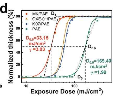 首先描述一下我自己的困惑。通过资料和文献的查阅我发现负性光刻胶的灵敏度是根据曝光能量(横坐标,mJ/cm2)与归一化膜厚度(D,%)做一个曲线,然后一般灵敏度是膜厚为D0.5时横坐标的数值。而横坐标又是光源的功率(mW/cm2)乘以时间t(s)算出来的。很多时候D0.5时的灵敏度为50-100 mJ/cm2。这种时候用365的i线光刻机照射几秒就可以了,为什么经常看到工艺曝光时间写5 min或者10 min。按理说不应该是上面横坐标的几秒钟吗?请问这种灵敏度曲线和后面光刻的曝光工艺的时间有什么关联呢?很疑惑,刚接触这个领域。比如下面图片中的D0.5为33.15 mJ/cm2(Adv. Funct. Mater. 2025, e09278)。但是文中工艺曝光时间确实10 min。感觉这10 分钟太长了。但是灵敏度确实33.15 mJ/cm2这么小。我都不太理解这个图怎么做出来的。 发自小木虫手机客户端 |