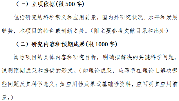 某省部级的自然基金可行性报告模板(见附件图),里面对各部分内容有字数的限制,而且限制的字数较少。 请教一下各位: 是严格按照字数限制的要求撰写? 还是不要理会字数限制的要求呢? 我个人感觉:限制的字数太少了,很难表达出什么;不按限制字数撰写,又怕被评审专家说“不守规矩”。 |