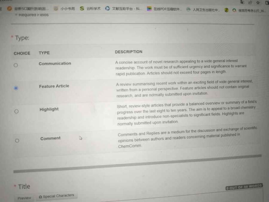 前段时间收到了ChemComm的邀稿,然后写了篇综述打算投过去,请问各位系统里的文章类型选feature article还是highlight呢?这两个有什么区别,含金量一样吗?另外,在上传文件时需要上传 table of contents entry 和data availability statement。这两个文件是什么意思,有模板吗?谢谢#sci论文 #投稿 发自小木虫手机客户端 |
