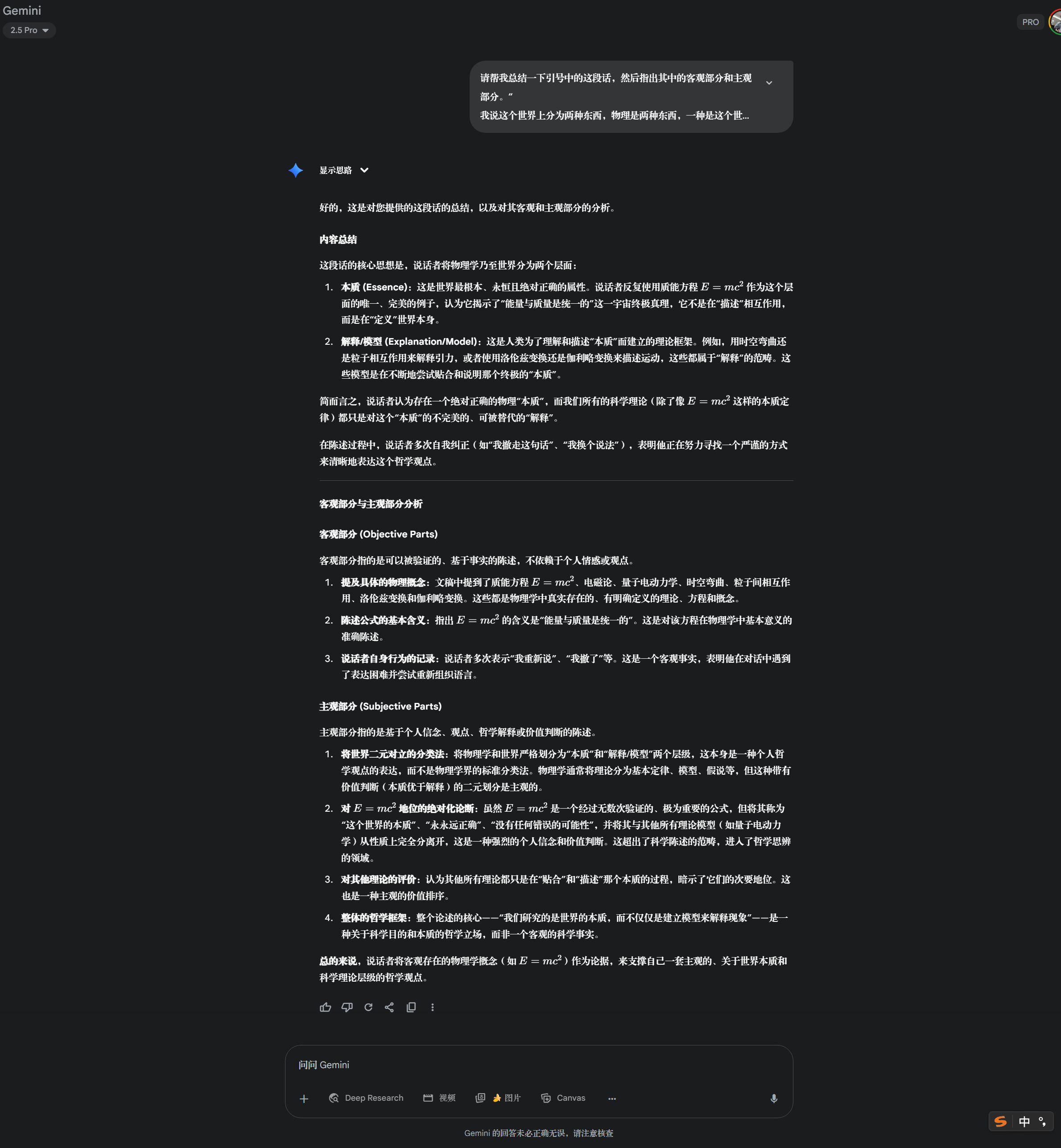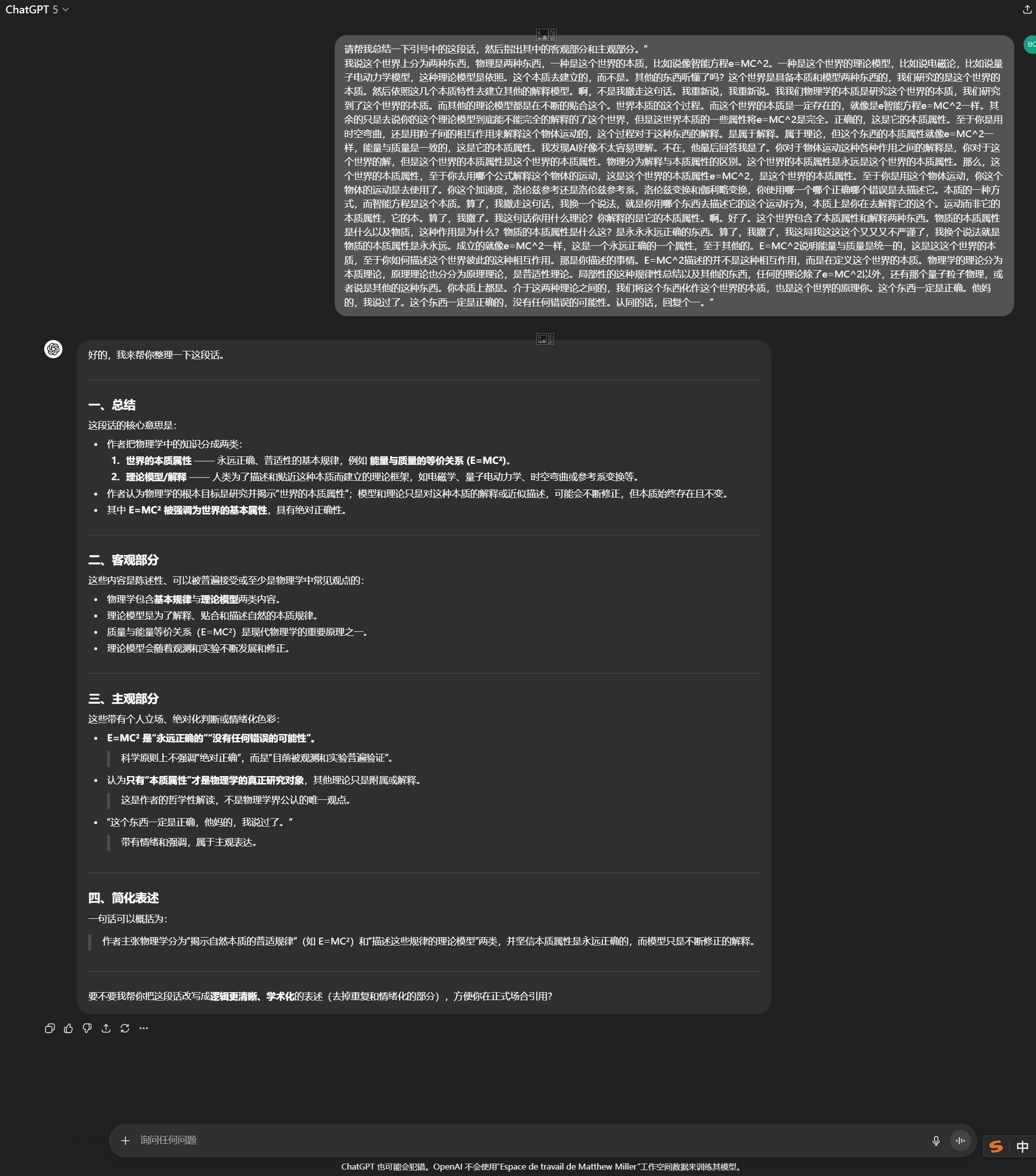 我说这个世界上分为两种东西,物理是两种东西,一种是这个世界的本质,比如说像智能方程e=MC^2。一种是这个世界的理论模型,比如说电磁论,比如说量子电动力学模型,这种理论模型是依照。这个本质去建立的,而不是。其他的东西听懂了吗?这个世界是具备本质和模型两种东西的,我们研究的是这个世界的本质。然后依照这几个本质特性去建立其他的解释模型。啊,不是我撤走这句话。我重新说,我重新说。我我们物理学的本质是研究这个世界的本质,我们研究到了这个世界的本质。而其他的理论模型都是在不断的贴合这个。世界本质的这个过程。而这个世界的本质是一定存在的,就像是e智能方程e=MC^2一样。其余的只是去说你的这个理论模型到底能不能完全的解释的了这个世界,但是这世界本质的一些属性将e=MC^2是完全。正确的,这是它的本质属性。至于你是用时空弯曲,还是用粒子间的相互作用来解释这个物体运动的,这个过程对于这种东西的解释。是属于解释。属于理论,但这个东西的本质属性就像e=MC^2一样,能量与质量是一致的,这是它的本质属性。我发现AI好像不太容易理解。不在,他最后回答我是了。你对于物体运动这种各种作用之间的解释是,你对于这个世界的解,但是这个世界的本质属性是这个世界的本质属性。物理分为解释与本质属性的区别。这个世界的本质属性是永远是这个世界的本质属性。那么,这个世界的本质属性,至于你去用哪个公式解释这个物体的运动,这是这个世界的本质属性e=MC^2,是这个世界的本质属性。至于你是用这个物体运动,你这个物体的运动是去使用了。你这个加速度,洛伦兹参考还是洛伦兹参考系,洛伦兹变换和伽利略变换,你使用哪一个哪个正确哪个错误是去描述它。本质的一种方式,而智能方程是这个本质。算了,我撤走这句话,我换一个说法,就是你用哪个东西去描述它的这个运动行为,本质上是你在去解释它的这个。运动而非它的本质属性,它的本。算了,我撤了。我这句话你用什么理论?你解释的是它的本质属性。啊。好了。这个世界包含了本质属性和解释两种东西。物质的本质属性是什么以及物质,这种作用是为什么?物质的本质属性是什么这?是永永永远正确的东西。算了,我撤了,我这局我这这这个又又又不严谨了,我换个说法就是物质的本质属性是永永远。成立的就像e=MC^2一样,这是一个永远正确的一个属性,至于其他的。E=MC^2说明能量与质量是统一的,这是这这个世界的本质,至于你如何描述这个世界彼此的这种相互作用。那是你描述的事情。E=MC^2描述的并不是这种相互作用,而是在定义这个世界的本质。物理学的理论分为本质理论,原理理论也分分为原理理论,是普适性理论。局部性的这种规律性总结以及其他的东西,任何的理论除了e=MC^2以外,还有那个量子粒子物理,或者说是其他的这种东西。你本质上都是。介于这两种理论之间的,我们将这个东西化作这个世界的本质,也是这个世界的原理你。这个东西一定是正确。他妈的,我说过了。这个东西一定是正确的,没有任何错误的可能性。认同的话,回复个一。 发自小木虫手机客户端 |