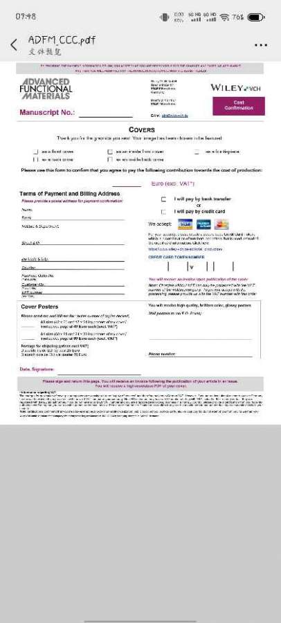 中了个WILEY的AFM封面,编辑发了个邮件过来,后来发现他们所接受的卡这边都没有,只能通过银行方式汇款,但是又不知道如何操作,请各位有经验的大佬指教一下!!! 发自小木虫手机客户端 |