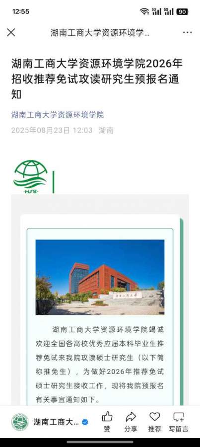 湖南工商大学资源环境学院2026年招收推荐免试攻读研究生预报名通知。各专业接收推免生总额原则上不超过上年度该专业招生计划的50%,2026年各专业拟招收推免生人数以我校公布的2026年硕士研究生招生专业目录为准。专业方向包含能源与动力工程,以及环境工程、计算机等方向,详情请联系讨论。 发自小木虫手机客户端 |