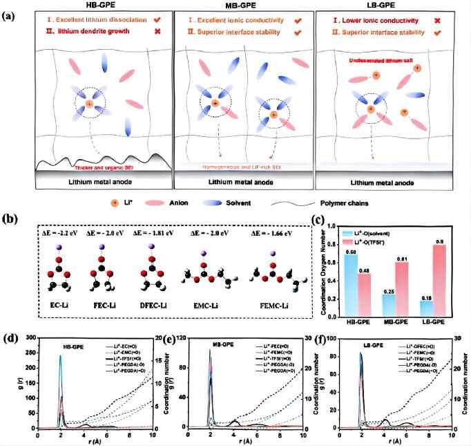 该文章发表在国际顶级期刊Energy & Environmental Science上。张少杰和李忠澎为本文共同第一作者。 在这项工作中,为了探寻溶剂化调控与电解质性能之间的关系,作者采用原位聚合策略设计、构建了具有不同Li+-溶剂结合力的GPEs。他们合成了三组具有不同氟化组分的凝胶电解质,即碳酸乙烯酯(EC)和碳酸甲乙酯(EMC)、氟化碳酸乙烯酯(FEC)和2,2,2-三氟乙基碳酸甲酯(FEMC)及二氟碳酸乙烯酯(DFEC)和FEMC,分别具有高Li+-溶剂结合力(HB-GPE)、中等Li+-溶剂结合力(MB-GPE)和低Li+-溶剂结合力(LB-GPE)。在本项工作中,与锂金属具有良好相容性的聚乙二醇二丙烯酸酯(PEGDA)被选择作为聚合单体。 https://m.thepaper.cn/baijiahao_30509154 |