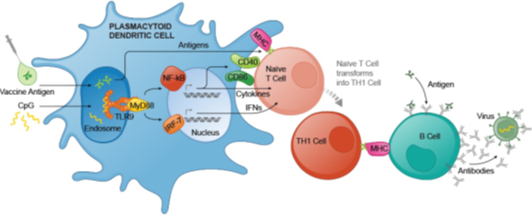 使用cpg佐剂的疫苗产生抗体更快、滴度更高、时间更长、缩短免疫程序、可激活细胞免疫。