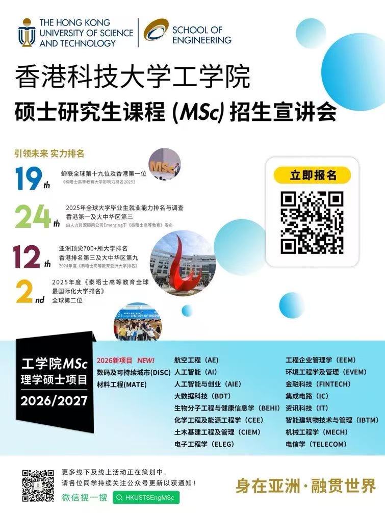 🔔香港科技大学工学院2026/2027年度硕士研究生(MSc)项目招生宣讲会