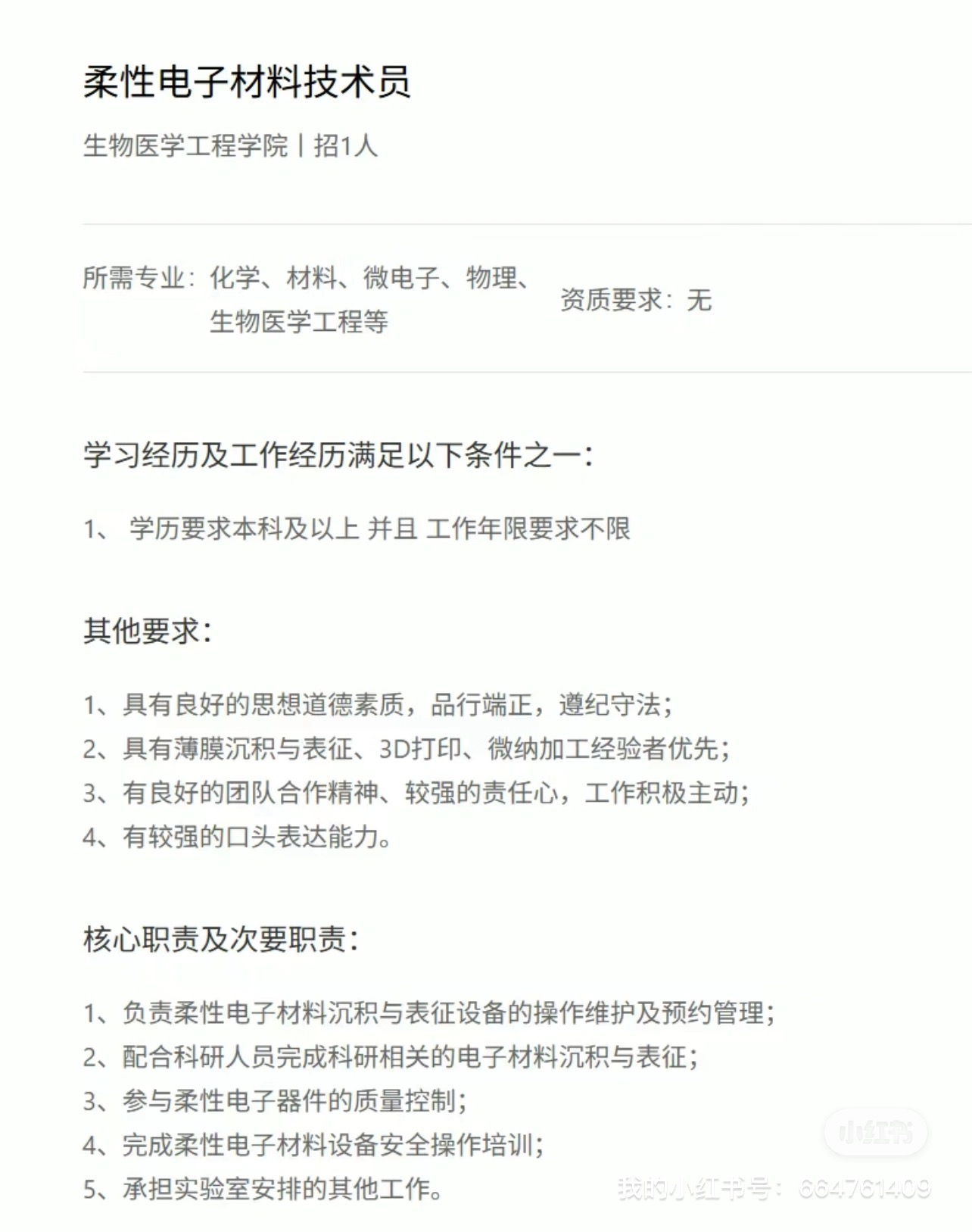 职位介绍 1、负责柔性电子微加工与测试相关设备的验收、日常运行及管理: 2、熟练掌握实验设备的操作,独立安全地完成操作工作; 3、负责实验数据的质量控制; 4、配合科研人员完成科研相关的数据采集、设备操作等工作; 5、承担实验室安排的其他工作。 设备包含(至少掌握以下一类):薄膜沉积设备(磁控溅射、电子束蒸发、衬底镀膜、喷墨打印等)、光刻设备、表面与电化学表征设备(电化学工作站、原子力显微镜等)、3d打印机和2d激光加工设备。具有微纳加工、柔性电子制备、pcb设计经验者优先。 工作地点坐落在环境优美的稻香湖环保科技园内,是一个新建的国家级实验平台,有国内乃至国际最先进的各种仪器设备。单位有有口皆碑的食堂(餐标1.7k/月)、班车等,科研节奏适宜,工作氛围友好。欢迎有志于实验室平台运行类工作的应往届生、社招人员,要求能一个月内到岗。待遇7-15k/月,(根据学历背景、工作经验、面试表现等评估),要求本科及以上。 有意者投递简历到yugang@qiyuanlab.com。 截止时间为2025年11月1日。 [ 来自版块群 北京 ] |