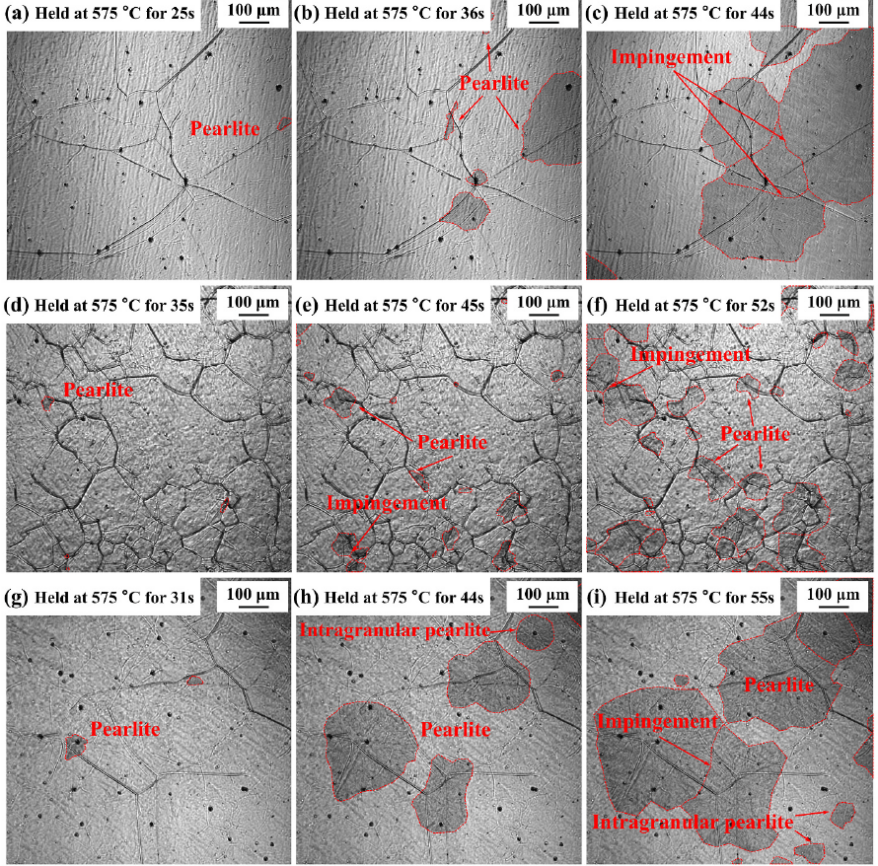 采用高温激光共聚焦显微镜(vl2000dx-svf17sp)直接观察了三种不同铌和钒添加量的高碳钢中珠光体的形成过程。基于原位观察结果,测量了珠光体团的数密度和生长速率以及珠光体的总体转变动力学。
