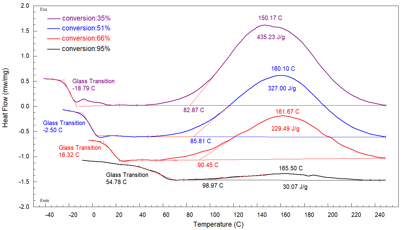 Èçͼ4Ëùʾ£¬ÎÒÃǶÔһϵÁв»Í¬¹Ì»¯¶È£¨35%, 51%, 66%, 95%£©µÄ»·ÑõÊ÷Ö¬ÑùÆ·½øÐÐdscɨÃ裬²âÊÔÆätg¡£