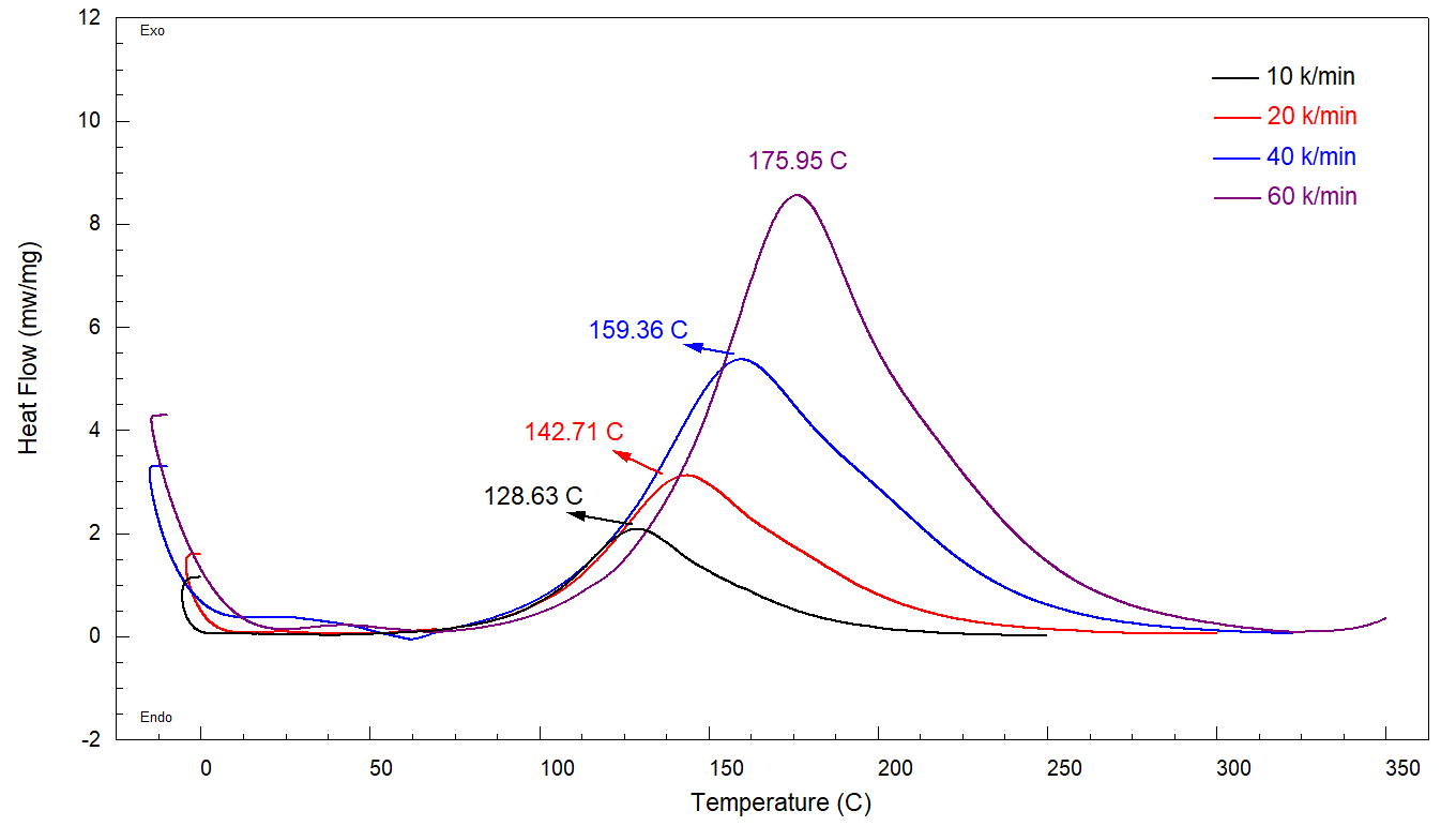 Èçͼ1Ëùʾ£¬ÎÒÃDzÉÓò»Í¬µÄÉýÎÂËÙÂÊ£¨10, 20, 40, 60 k/min£©¶Ô»·ÑõÊ÷Ö¬ÑùÆ·½øÐж¯Ì¬dscɨÃè¡£¿ÉÒԹ۲쵽£¬Ëæ×ÅÉýÎÂËÙÂʵÄÌá¸ß£¬¹Ì»¯·ÅÈÈ·åÏò¸ßη½ÏòÒÆ¶¯¡£ÀýÈ磬·åֵζȣ¨tp£©´Ó10 k/minʱµÄ142.71¡æÆ«ÒÆÖÁ60 k/minʱµÄ175.95¡æ¡£ÕâÊÇÒ»ÖÖµäÐ͵͝Á¦Ñ§Ð§Ó¦£¬ÉýÎÂËÙÂÊÔ½¿ì£¬ÌåϵÔÚµ¥Î»Ê±¼äÄÚÎüÊÕµÄÄÜÁ¿Ô½¶à£¬µ¼Ö·´Ó¦Öͺó£¬ÌØÕ÷ζÈÉý¸ß¡£