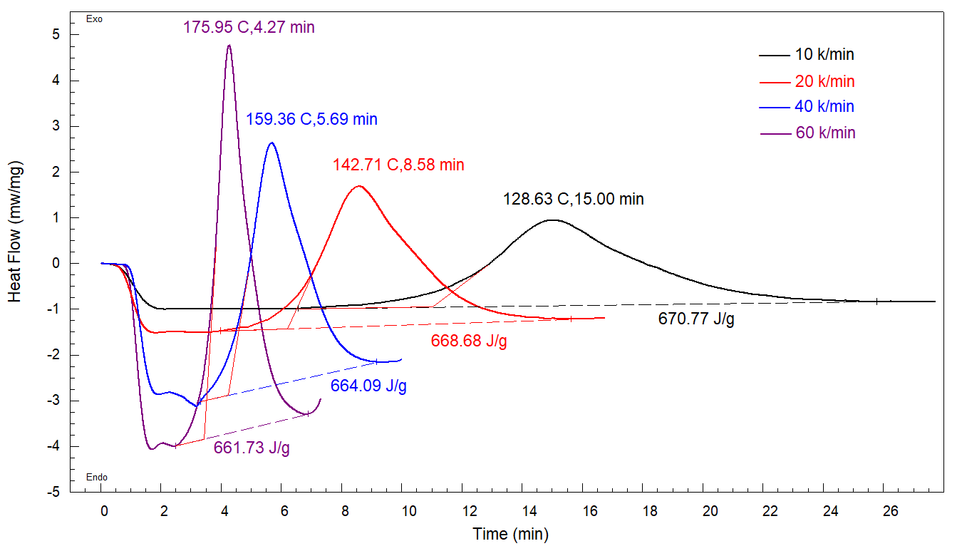 ͼ 2 ÀûÓÃdsc 600µÄ·ÖÎöÈí¼þ¼ÆËã¸÷ÉýÎÂËÙÂÊÏ»·ÑõÊ÷Ö¬½ºÕ³¼ÁµÄ¹Ì»¯·ÅÈÈìÊÖµ£» ºá×ø±êΪʱ¼ätime(min)