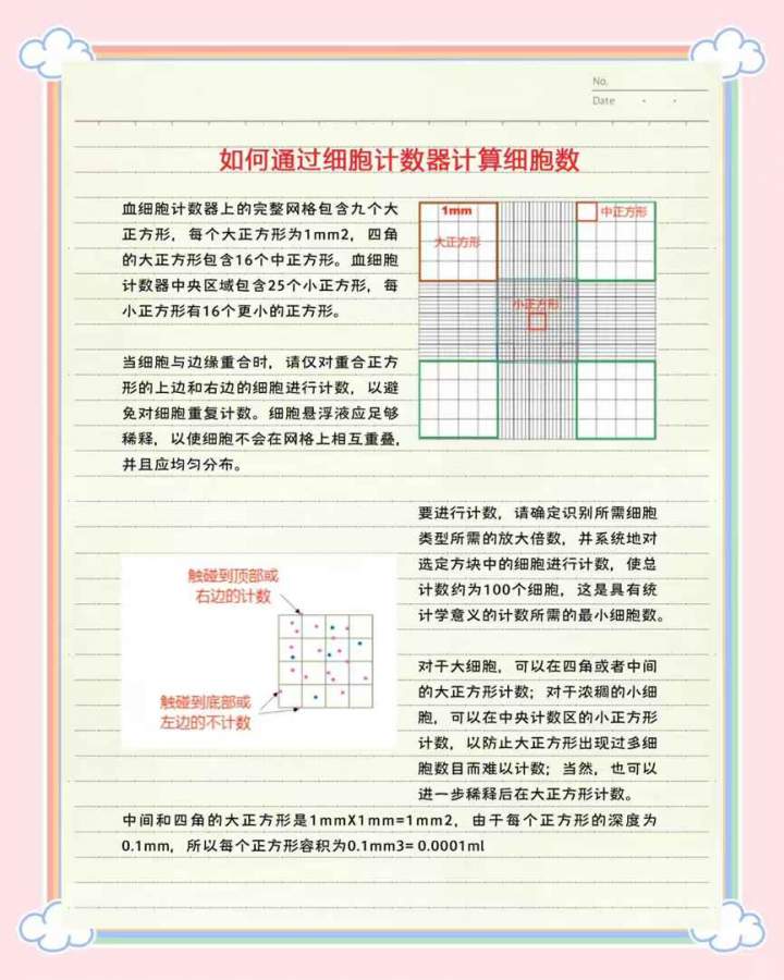 5秒学会细胞计数 血细胞计数器:计数的基础工具 首先,咱们得有个血细胞计数器。这个工具上有一个网格,网格里有九个大正方形,每个正方形是1mm2。四角的大正方形里还有16个中正方形。而中央区域则有25个小正方形,每个小正方形里又有16个更小的正方形。 如何避免重复计数? 当细胞与边缘重合时,咱们只需要数那些与边缘重合的正方形上的上边和右边的细胞。这样就能避免重复计数啦! 细胞悬浮液要稀释吗? 是的,细胞悬浮液需要足够稀释,这样细胞才不会在网格上相互重叠。而且,均匀分布的细胞更有利于计数哦! 放大倍数怎么选? 在进行计数之前,先确定你需要识别的细胞类型所需的放大倍数。然后,系统地对选定方块中的细胞进行计数,确保总计数大约为100个细胞。这样就有统计学意义啦! 大细胞和小细胞的计数技巧 对于大细胞,你可以在四角或者中间的大正方形里计数;而对于浓稠的小细胞,建议在中央的小正方形里计数,这样更容易操作。当然,如果细胞太多,也可以先稀释后再在大正方形里计数。 正方形的容积是多少? 中间和四角的大正方形是1mm X 1mm=1mm2。由于每个正方形的深度为0.1mm,所以每个正方形的容积是0.1mm3=0.0001ml。 发自小木虫手机客户端 |