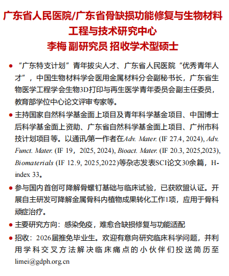 招收:2026届推免毕业生。欢迎有意向研究临床科学问题,并利用学科交又方法解决临床痛点的小伙伴们投送简历至limei@gdph.org.cn
