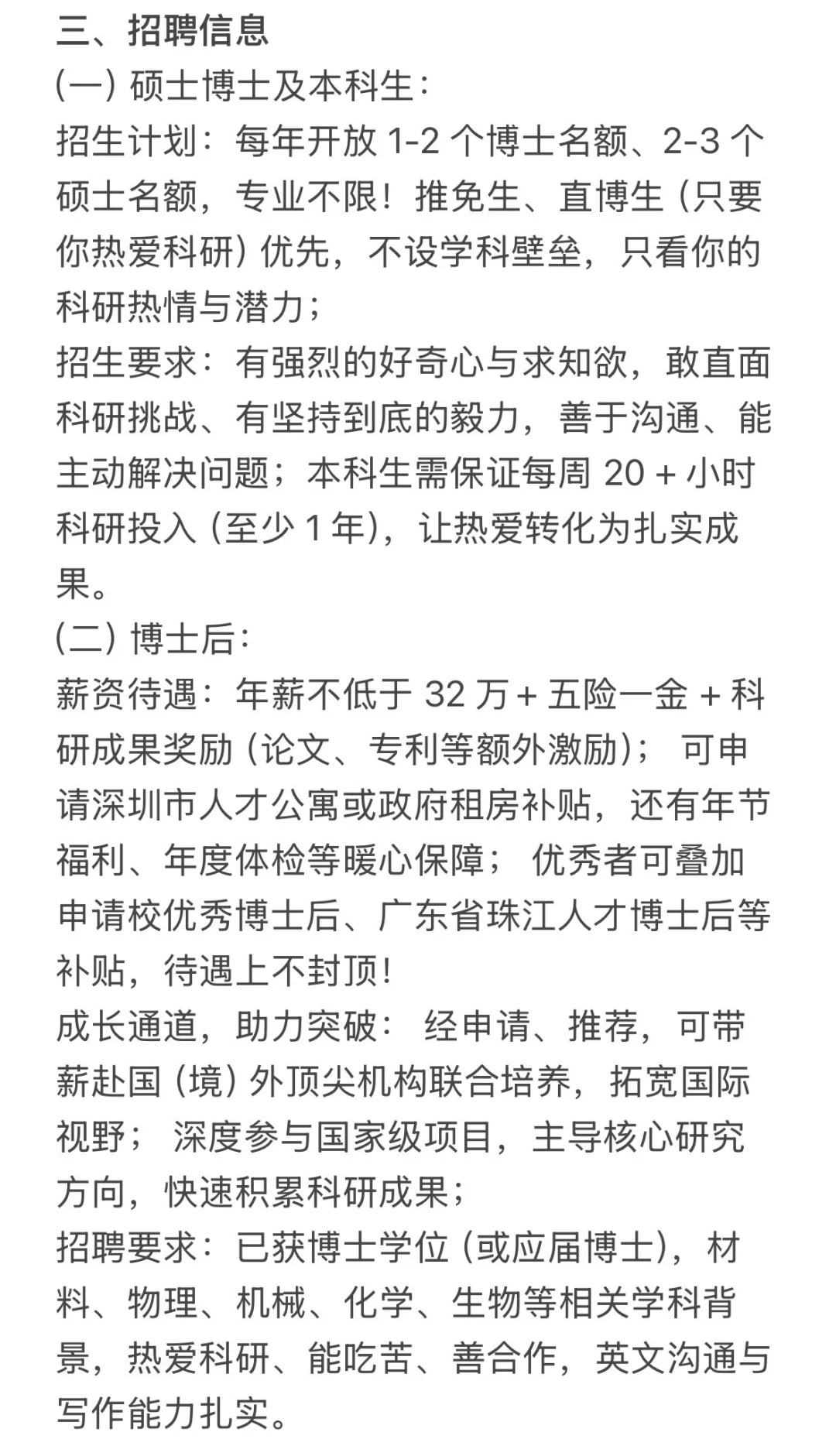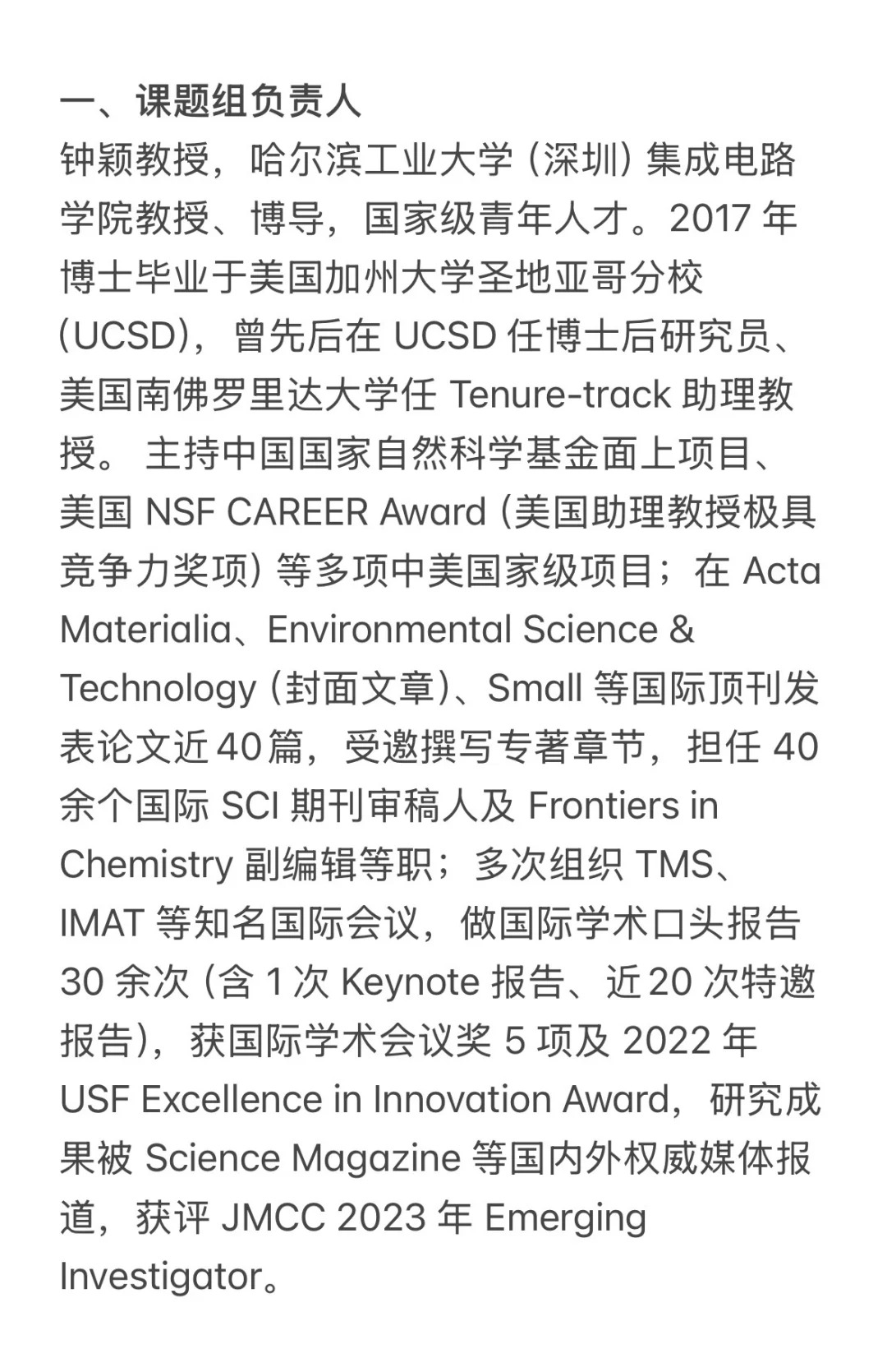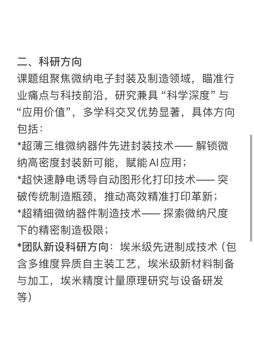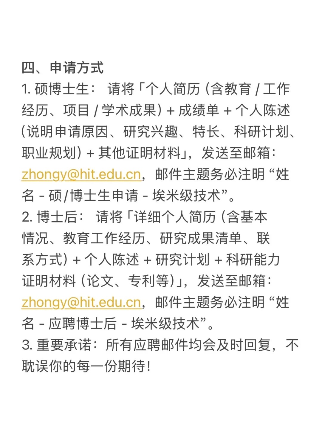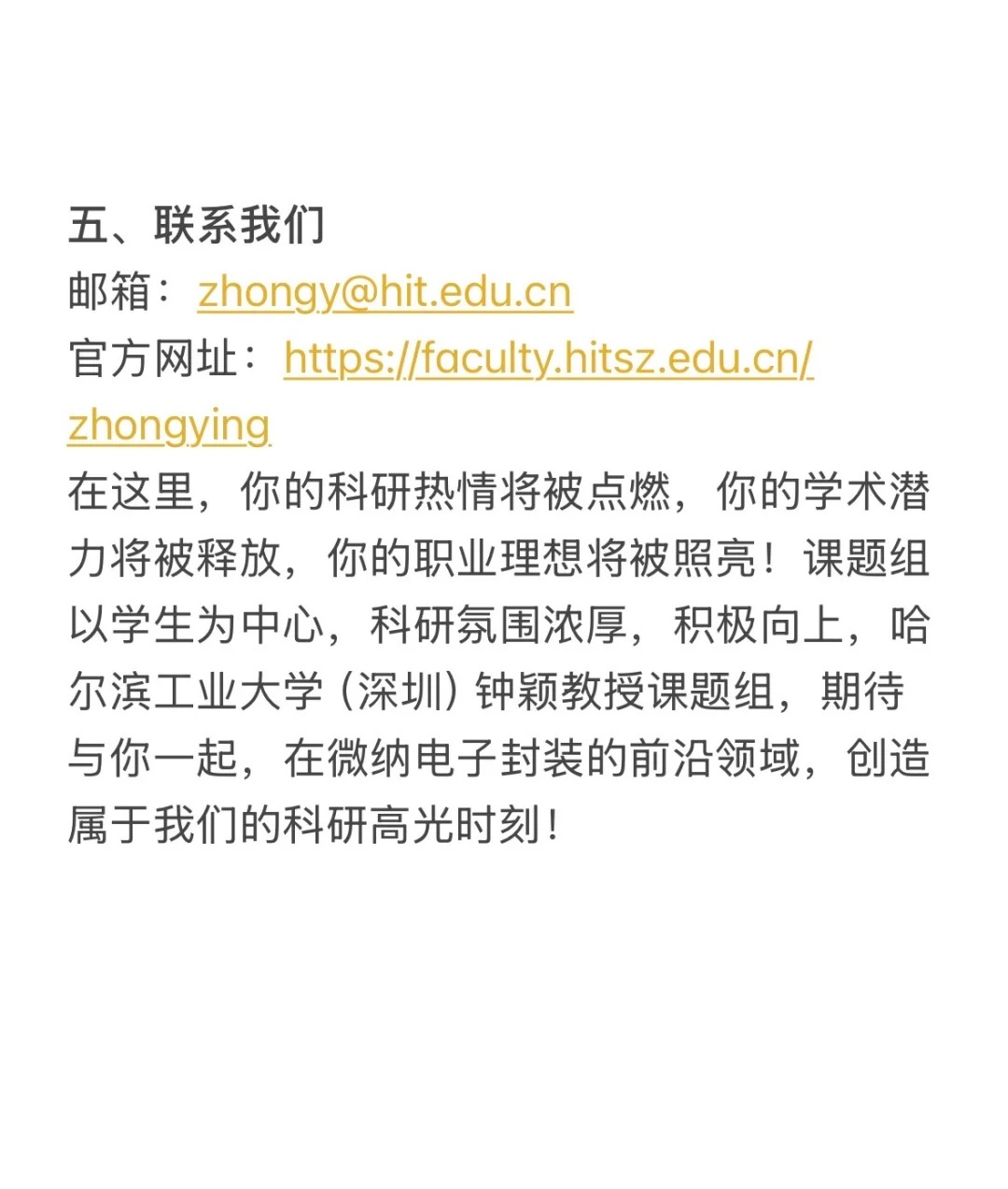 导师简介 钟颖,哈尔滨工业大学(深圳)集成电路学院教授/博导、国家级青年人才,ucsd博士毕业,曾职教于美国南佛罗里达大学,主持多项中美国家级项目(含美国nsf career award)! 前沿科研方向 聚焦微纳电子封装,含超薄三维器件封装、超快速静电打印、先进微纳封装技术,新增埃米级先进制成技术(异质自主装、新材料制备等)。 岗位&福利 硕博/本科:每年1-2博、2-3硕名额,专业不限!本科生需每周20h+科研(至少1年)。 博后:年薪≥32万+五险一金+科研奖励,可申深圳人才待遇,优秀者补贴上不封顶。 申请方式 博士:发「简历+成绩单+个人陈述」至zhongy@hit.edu.cn,主题注“姓名-硕/博士生申请-埃米级技术” 博后:发「简历+个人陈述+研究计划」至同邮箱,主题注“姓名-应聘博士后-埃米级技术” 承诺:所有邮件必回复! 官网:https://faculty.hitsz.edu.cn/zhongying |