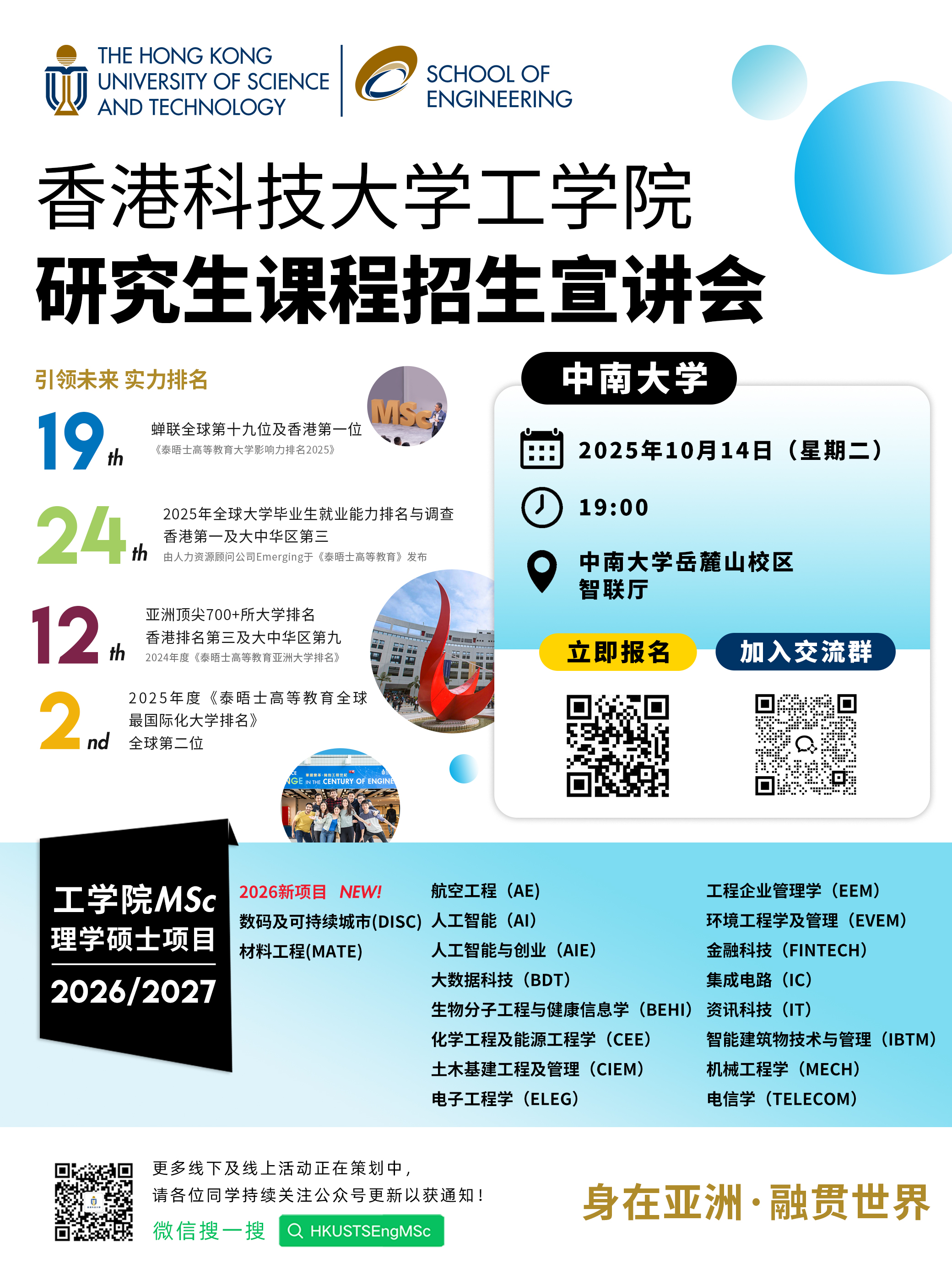 🔔香港科技大学工学院2026/2027年度研究生课程招生宣讲会-中南大学专场