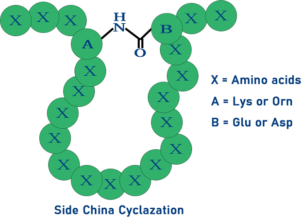 二、酰胺键-多肽侧链成环 我们通过对Lys或者Orn侧链氨基以及Glu或者Asp侧链羧基选择性保护及脱除可以实现多肽准确位点成环。可合成稳定的高品质产品。