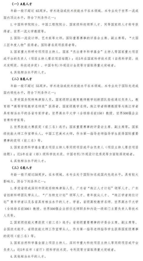 深圳职业技术大学诚聘海内外高层次人才(长期招聘) 专业领域:包括但不限于集成电路与计算科学、脑科学与人工智能、高端装备与智能制造、智能网联汽车、数字创意、工业设计、新能源、新材料、物联网、大数据、大健康、经济管理、马克思主义理论等专业领域 一、薪资待遇(一人一议) (一)年薪 学校制定了完善的高层次人才待遇体系,年薪40万至120万。以事业编制引进的按照深圳市人社局核准聘岗等级薪酬标准执行。 (二)住房 学校提供校内外周转住房 (三)科研启动费 根据所属人才层次和专业类别,可申请90万至 500万科研启动经费。 二、人才层次 详见图1 三、应聘方式 应聘者注册并登录以下网址报名:https://zp.szpu.edu.cn/。学校接收到应聘材料后,人事处会同相关部门对应聘人员材料进行资格审核。对符合招聘岗位需求的人员,邀请其来校参加考核。 四、深圳职业技术大学人事处联系方式 人事处邮箱:renshi@szpu.edu.cn 应聘联系人:陈老师 0755-26019702 发自小木虫手机客户端 |