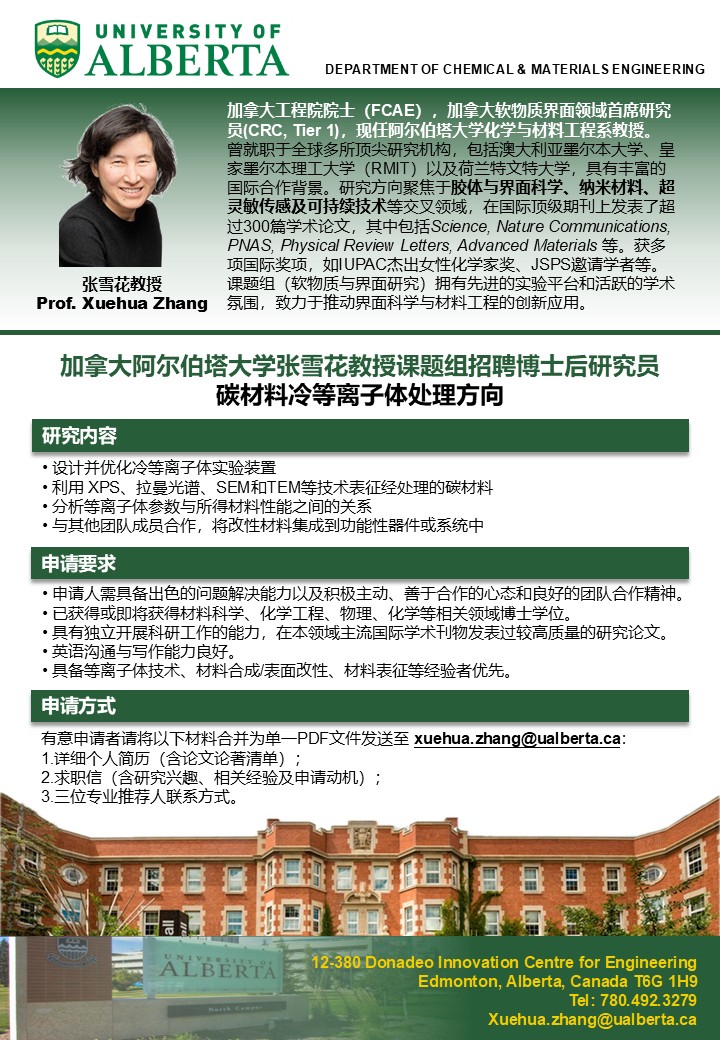 加拿大阿尔伯塔大学张雪花教授 课题组招聘碳材料冷等离子体处理方向博士后!