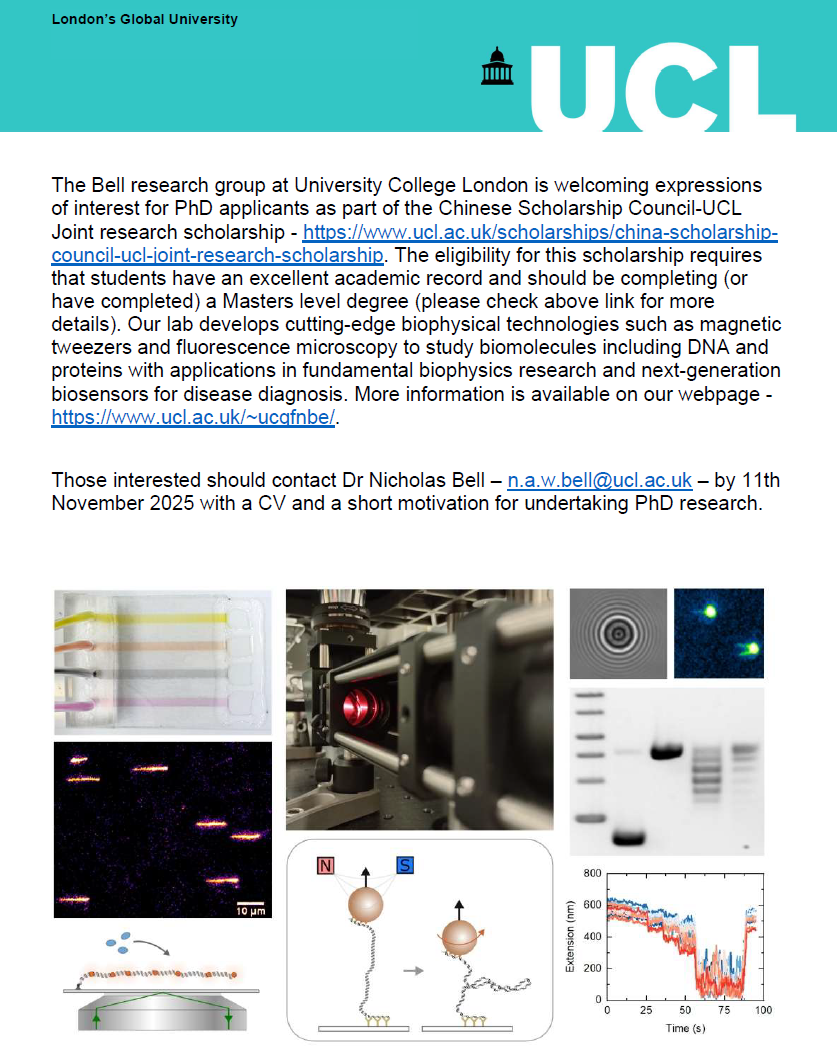 英国UCL物理系Nicholas Bell课题组招收博士研究生 导师主页:https://www.ucl.ac.uk/mathematic ... me-dr-nicholas-bell 课题组网站:https://www.ucl.ac.uk/~ucqfnbe/team.html The Bell research group at University College London is welcoming expressions of interest for PhD applicants as part of the Chinese Scholarship Council-UCL Joint research scholarship - https://www.ucl.ac.uk/scholarshi ... search-scholarship. The eligibility for this scholarship requires that students have an excellent academic record and should be completing (or have completed) a Masters level degree (please check above link for more details). Our lab develops cutting-edge biophysical technologies such as magnetic tweezers and fluorescence microscopy to study biomolecules including DNA and proteins with applications in fundamental biophysics research and next-generation biosensors for disease diagnosis. More information is available on our webpage -https://www.ucl.ac.uk/~ucqfnbe/. Those interested should contact Dr Nicholas Bell – n.a.w.bell@ucl.ac.uk – by 11th November 2025 with a CV and a short motivation for undertaking PhD research. 感兴趣的同学可直接联系(n.a.w.bell@ucl.ac.uk)或者通过国科大陈凯凯(chenkaikai@ucas.ac.cn)联系。 |