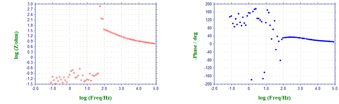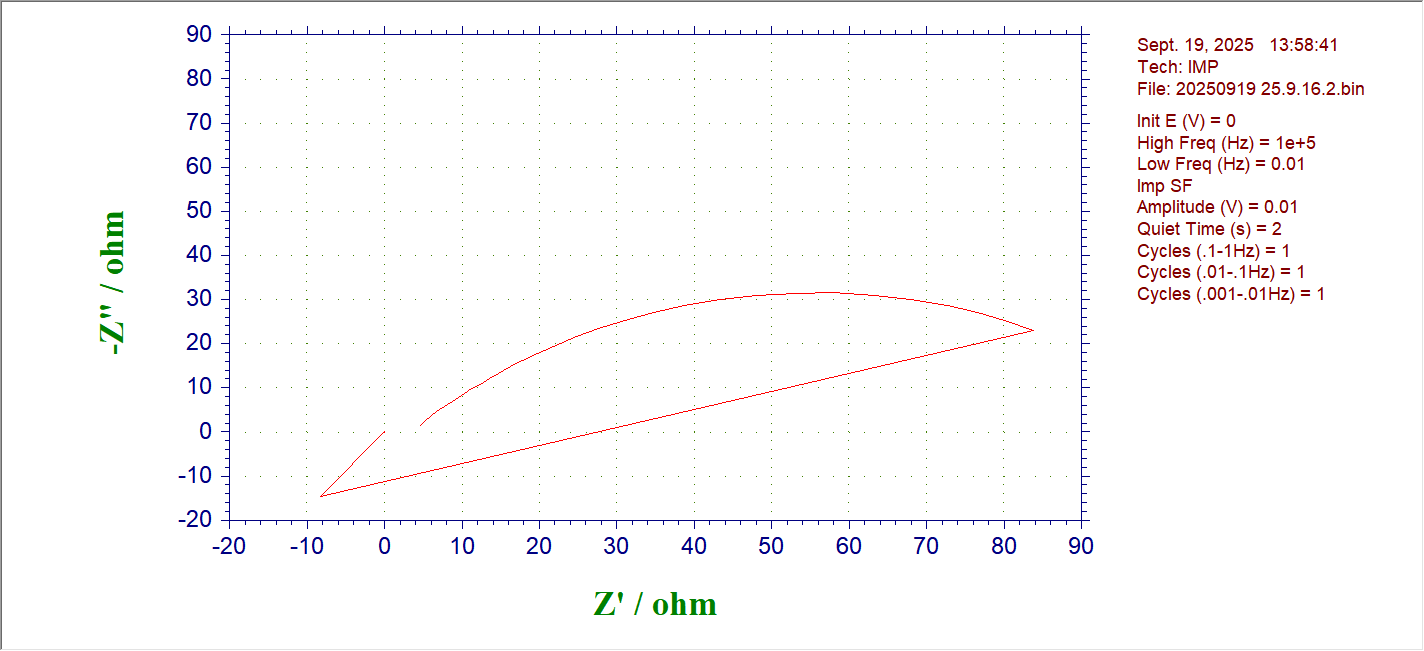 在做电极材料的eis分析时,设置如下图,在刚开始数据点连续且正常,进入低频区后电化学工作站扫描点就变得杂乱无章,测试完毕后就出现了下图现象。想问一下这是为什么?什么原因造成的?是我设置的有问题吗?还是电极材料有问题?还是电化学工作站出问题了?
