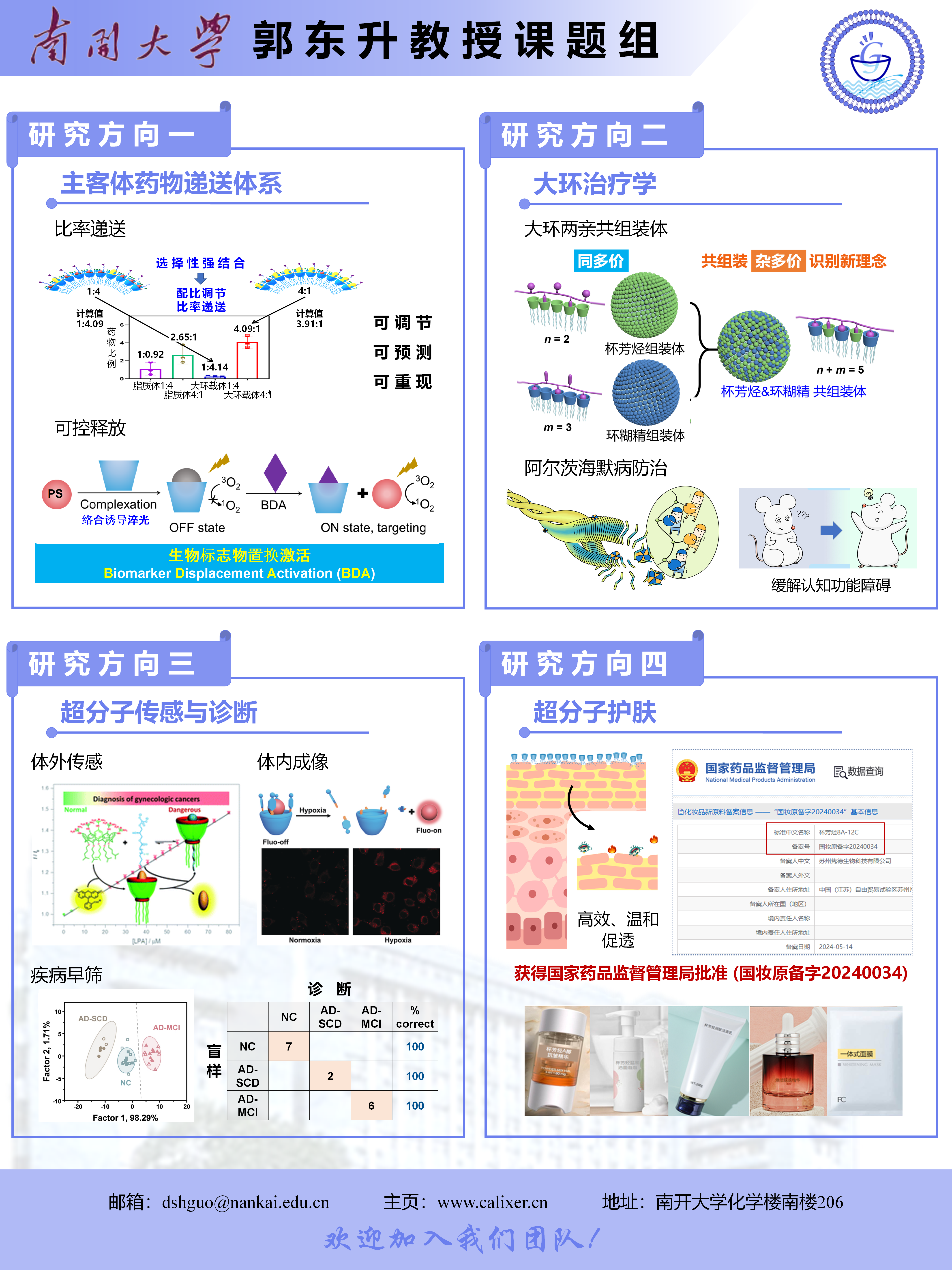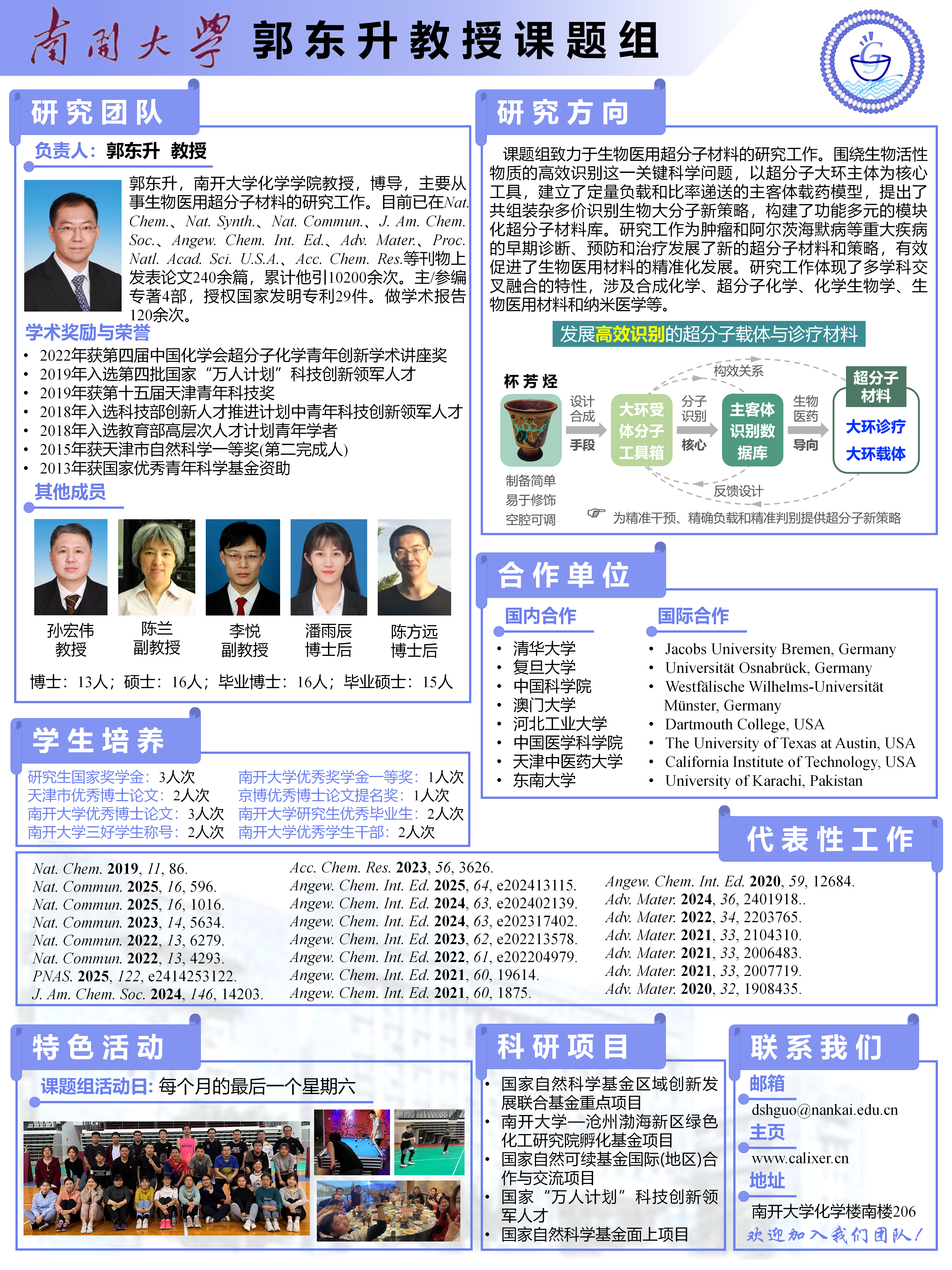南开大学化学学院郭东升课题组招聘副教授、博士后及博士、硕士研究生 招聘人数:5-8名 职位分类:副教授、博士后、博士研究生、硕士研究生 工作类型:全职 职位详情:工作地点:天津市 因科研工作需要,南开大学化学学院郭东升课题组面向国内外招聘副教授、博士后及博士、硕士研究生,欢迎对超分子化学、生物医用材料和纳米医学等相关领域感兴趣的老师和同学加盟。 副教授岗位: 应聘条件: 1. 已取得博士学历及学位,且取得博士学位后全职从事科研工作2年及以上; 2. 年龄一般在35周岁以下,具有较大的学术潜力。取得同行认可的科研成果,科研能力突出,已发表具有高影响力的SCI论文; 3. 思维开放,热爱科研工作,具备成为大学教师所必需的政治素质、道德素养和团队协作精神。 工资待遇: 1. 工资和福利待遇按南开大学政策统一执行,南开大学和化学学院将在薪酬待遇、科研经费、住房补贴、团队组建、研究生招收和国际化培养等方面,为各类人才提供富有竞争力的支持; 2. 学校配备周转住房、师资优良的幼儿园、附属小学和附属医院等设施,为人才营造安心工作的发展环境,特别突出的优秀拔尖人才可以就相关待遇面议。 具体详情及要求请见南开大学人事处网站及化学学院招聘通知: https://rsc.nankai.edu.cn/ https://mp.weixin.qq.com/s/l6eWTd3D-kdJ_Tl-mLmn1g 或者发email给郭东升教授咨询。 博士后岗位: 应聘条件: 1. 在知名高校、科研机构获得博士学位,具有化学、材料、生物医药等相关研究背景者优先; 2. 取得同行认可的科研成果,科研能力突出,已发表具有高影响力的SCI论文; 3. 良好的英语读写能力和交流能力;优秀的分析能力与学习能力;能独立思考并开展课题,同时又富有团队协作意识与合作精神。 工资待遇: 1. 工资和福利待遇按南开大学政策统一执行,年薪20-40万; 2. 第一个聘期为二年,第二个聘期为二年,最多聘任两个聘期,优秀者可申请留校任教,并在博后期间享受更高的薪酬待遇。 3. 享受学校事业编制教师的各项待遇,解决子女入托、入学(小学); 具体详情及要求请见南开大学化学学院博士后招聘通知: https://chem.nankai.edu.cn/2021/0704/c24589a378805/page.htm 或者发email给郭东升教授咨询。 博士、硕士研究生: 本课题组现拟招收2026级博士、硕士研究生,要求如下: 1. 具有化学、材料、生物医药等相关领域学习和研究背景的本科生及硕士生; 2. 对科学研究有兴趣和热情,工作积极主动,踏实勤劳,具有团队协作精神; 3. 具有良好的英文读写能力。 联系方式: 郭东升教授:Email:dshguo@nankai.edu.cn 课题组主页:https://calixer.cn/ 欢迎有志于从事科研工作的优秀老师和同学加入!有意向者请投递简历及代表性论文至郭东升教授邮箱,招聘长期有效。 课题组研究方向: 课题组致力于生物医用超分子材料的研究工作,将超分子化学的基本理念应用于开发新的疾病诊断和治疗策略。课题组以超分子大环主体为材料基元,以分子设计合成为基础,以识别和组装性质为手段,以生物医药功能为导向,致力于开发一类具有主客体识别位点的新型生物医用材料,探索其在药物递送、传感成像和干预治疗等领域的功能,为实现精准医疗提供新方法,发展新材料。研究工作体现了多学科交叉融合的特性,涉及合成化学、超分子化学、化学生物学、生物医用材料和纳米医学等。课题组正在开展的研究课题包括: 1. 主客体药物递送体系; 2. 大环治疗学; 3. 超分子传感与诊断; 4. 超分子护肤。 课题组组长简介: 郭东升,南开大学化学学院教授/博导,目前已在Nat. Chem.、Nat. Synth.、Nat. Commun.、Acc. Chem. Res.、J. Am. Chem. Soc.、Angew. Chem. Int. Ed.、Adv. Mater.、Proc. Natl. Acad. Sci. U.S.A.等刊物上发表论文240余篇,累计他引10200余次。主编专著1部,参编专著3部,申请中国发明专利45件(29件已授权),在国内、外学术交流会议上做学术报告120余次。 在成果转化与应用方面,致力于超分子药物和高端药用/护肤品辅料的研发。2019年获南开大学-沧州渤海新区绿色化工研究院孵化基金资助;2020年获苏州高新区科技创新创业领军人才项目。其中,杯芳烃8A-12C已实现工业化量产,被国家药品监督管理局准许作为化妆品新原料使用(国妆原备字20240034),开辟了高端药用/护肤品辅料的超分子新赛道。 2013年获国家优秀青年科学基金资助,入选南开大学百名青年学科带头人培养计划;2014年入选天津市青年拔尖人才支持计划,天津市创新人才推进计划青年科技优秀人才;2018年先后入选天津市、科技部创新人才推进计划中青年科技创新领军人才;同年入选教育部高层次人才计划青年学者;2019年入选第四批国家“万人计划”科技创新领军人才;2015年获天津市自然科学一等奖;2019年获第十五届天津青年科技奖;2020年获首届南开大学科学研究奖青年创新奖;2022年获第四届中国化学会超分子化学青年创新学术讲座奖。目前担任《中国化学快报》编委,《Supramolecular Materials》编委,《Frontiers in Chemistry》编委,天津科技大学学报编委,中国抗癌协会医工整合专业委员会常务委员,生物资源材料与再生医学学术大会学术委员会委员,全国光功能材料青年学者研讨会学术委员会委员,第五届抗菌科学与技术论坛学术委员会委员,天津市耐高温工业酶企业重点实验室学术委员会委员,天津市脑血管疾病与神经变性病重点实验室学术委员会委员,中国感光学会青年理事,天津市化学