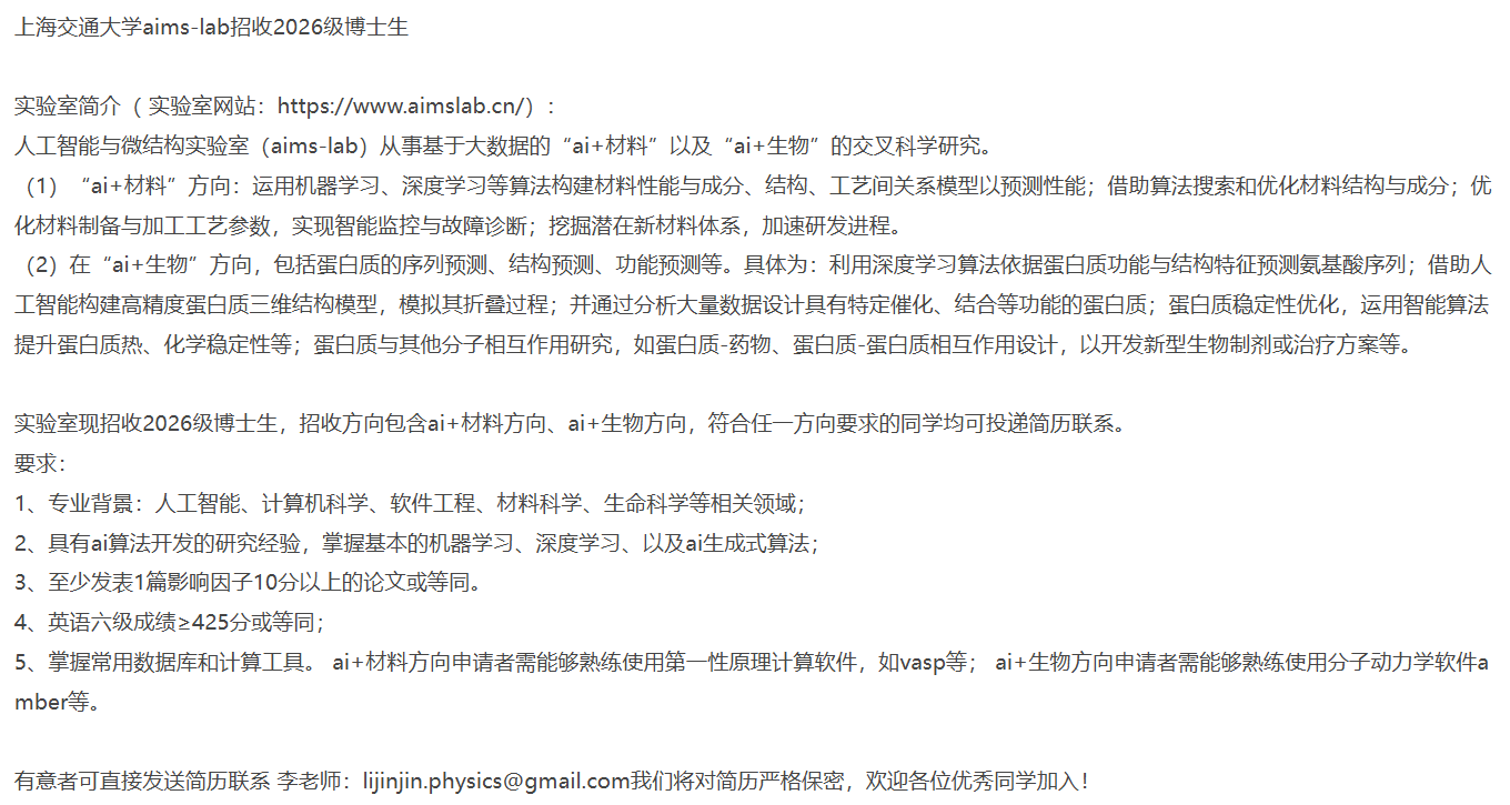 上海交通大学AIMS-Lab招收AI for Science方向2026级博士生