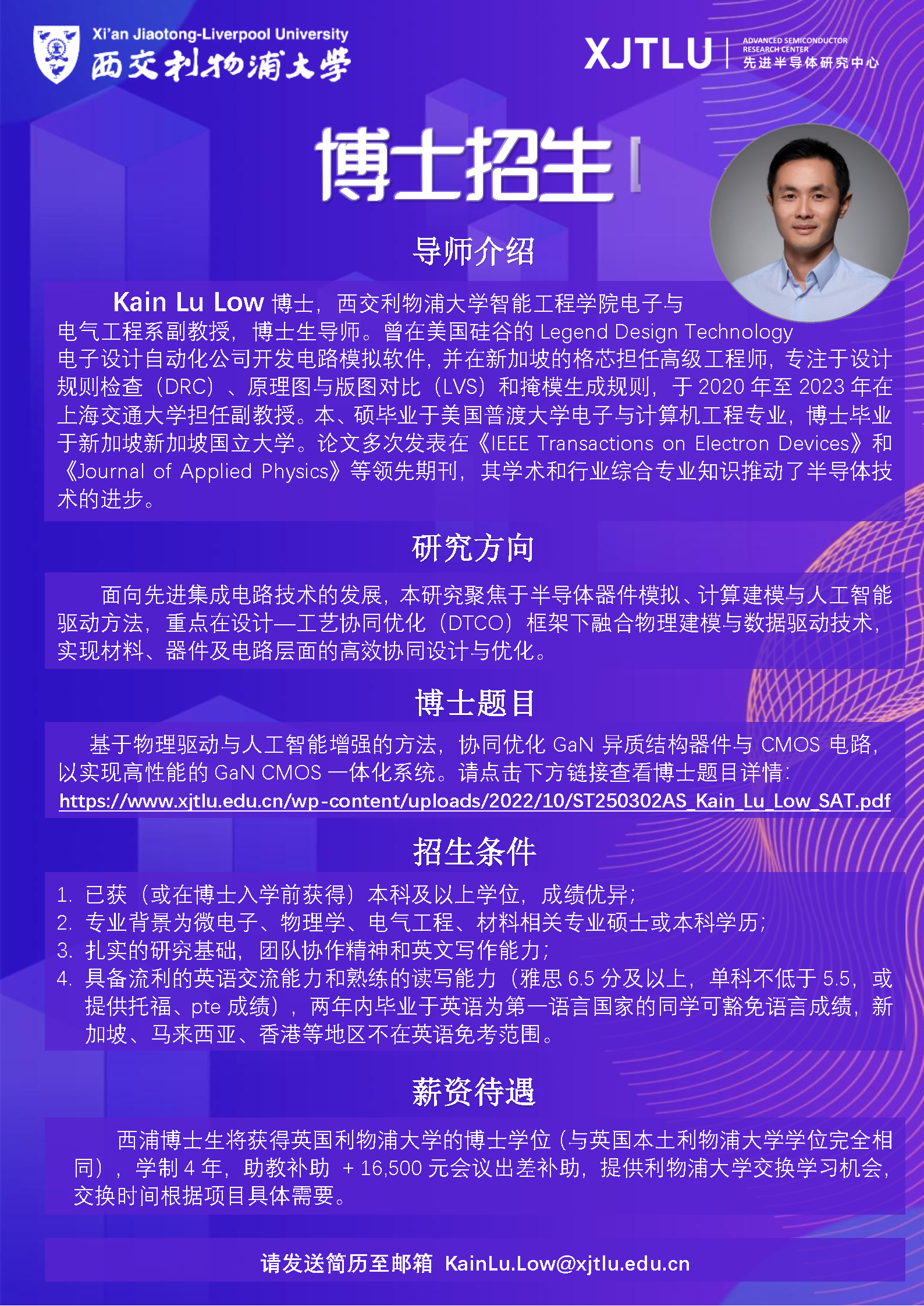 面向先进集成电路和宽禁带半导体技术的快速演进,我们正在招募全职博士研究生(可 2026 入学)。本课题组聚焦: 研究方向 - 半导体器件仿真(tcad)与计算建模 - 物理建模 + 人工智能驱动的混合方法 - 设计╟工艺协同优化(dtco) - 异质结构器件设计 项目旨在结合物理模型、数据驱动优化与智能化设计框架,实现材料╟器件╟电路的一体化协同优化,并推动下一代 gan cmos 技术的发展。 招生条件 我们期待你具备: 1. 本科或硕士学历(入学前取得),专业包括:微电子、电子工程、物理、材料等相关方向 2. 具备良好的学术成绩与研究能力 3. 积极主动、具有团队合作精神 4. 优秀的英文读写与沟通能力(雅思 ≥ 6.5,单项 ≥ 5.5;或托福/pte 成绩) 注:新加坡、马来西亚、香港等地区学历申请者 不免语言成绩 培养模式与待遇 - 学制 4 年全日制博士 - 获得 英国利物浦大学博士学位(与英国本部完全一致) - 学术交流:可申请前往利物浦大学短期访问 - 资助:助教津贴 + 年度会议差旅补助 16,500 元 - 完善的科研环境:synopsys tcad、hpc 计算平台、gan 器件实验与仿真协同支持 导师简介 — dr. kain lu low 西交利物浦大学智能工程学院电子与电气工程系副教授、博士生导师。 经历亮点: - 美国硅谷 legend design technology 从事 eda 电路模拟工具开发 - 新加坡格芯(globalfoundries)资深工程师:drc/lvs/mask rule - 曾任上海交通大学副教授(2020╟2023) - 学历背景:美国普渡大学(本/硕)→ 新加坡国立大学(博士) - 论文发表于 ieee ted、jap 等国际领先期刊 - 具备“产业 + eda + tcad + 宽禁带器件”复合背景,适合培养跨界型青年科研人才 博士课题详情(gan cmos 方向) 基于物理驱动与 ai 增强的方法,对 gan 异质结构器件及 cmos 电路进行协同优化: ➡ 课题详情:https://www.xjtlu.edu.cn/wp-cont ... Kain_Lu_Low_SAT.pdf 申请方式 欢迎有志于半导体器件与 ai 交叉研究的同学联系报名。 请将简历发送至:kainlu.low@xjtlu.edu.cn |