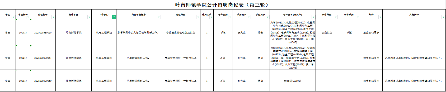 根据《广东省事业单位2025年集中公开招聘高层次和急需紧缺人才公告》及有关工作安排,本次招聘第二轮未招满的岗位,后续将滚动招聘。现就第三轮招聘有关事项公告如下: 一、招聘岗位 我校招聘工作人员62名。具体的招聘单位、岗位、人数和资格条件见附件。应聘人员也可通过广东省人力资源和社会保障厅网站(https://hrss.gd.gov.cn)查阅相关信息。 二、报名 本轮招聘实行网络报名,报名时间为2025年11月17日9:00至21日16:00,应聘人员请登录“广东省事业单位公开招聘信息管理系统(考生报名)”(https://ggfw.hrss.gd.gov.cn/sydwbk)报名。报名事宜详见系统中的《系统报名指南》。应聘人员只能选择一个岗位报名。 本轮招聘实行诚信报考,已于2025年5月9日至16日及2025年8月11日至29日报名参加本次第一、二轮招聘并被确定为拟聘用人员的,不得参加第三轮招聘。 三、其他事项 考试、体检、考察、公示、聘用等其他事项,均按《广东省事业单位2025年集中公开招聘高层次和急需紧缺人才公告》执行。原公告《报考指南》中涉及“报名首日”的表述,均以第三轮招聘报名开始时间另行计算。 详细见关于广东省事业单位2025年集中公开招聘高层次和急需紧缺人才第三轮招聘有关事项的公告-岭南师范学院人事处 https://d.lingnan.edu.cn/rsc/info/2123/15872.htm 岭南师范学院机电工程学院公开招聘岗位表(第三轮滚动招聘) |