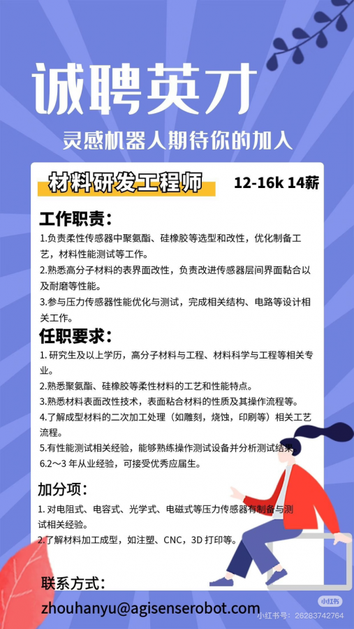 我们是一家致力于为机器人研发高精度力触觉感知技术的前沿科技企业,从事具身智能上游核心零部件触觉与力觉传感器的研发与生产,并提供支持多模态传感器解析与应用的AI算法服务,推动机器人操作能力精细化与通用化。 团队与战略:全职团队主要成员为来自国内外顶级名校机器人领域的专家、国内一线大厂资深技术负责人以及行业老兵,团队采取科技前沿探索以及商业化落地并重的策略。 你将获得:初期员工入职后将能够在具身智能与触觉感知领域知识与技能、高科技研发与产品化,工业级的算法与软件交付等方面快速成长。员工除了获得常规福利外,也将依据表现获得丰厚奖金与期权,实现与公司共同成长。 希望你是:脚踏实地,仰望星空,敬业合作,灵感无限! 感兴趣请投递:zhouhanyu@agisenserobot.com 标题格式:招聘+岗位名称+姓名+毕业/就读院校 目前招聘岗位(见附图): 材料研发工程师 1人 硬件工程师/实习生 1人 机械实习生 1人 工作地点:深圳市南山区。 发自小木虫IOS客户端 |