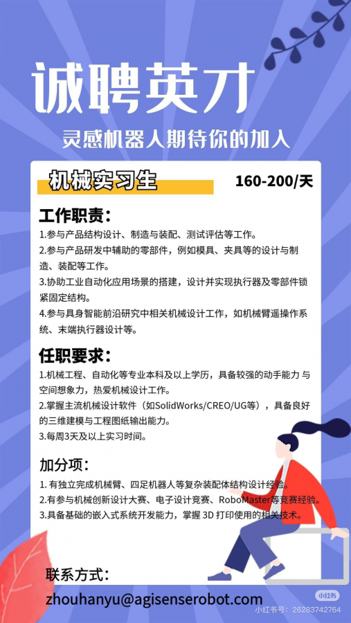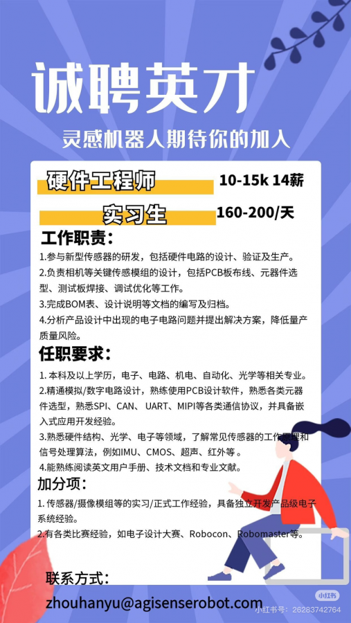 我们是一家致力于为机器人研发高精度力触觉感知技术的前沿科技企业,从事具身智能上游核心零部件触觉与力觉传感器的研发与生产,并提供支持多模态传感器解析与应用的AI算法服务,推动机器人操作能力精细化与通用化。 团队与战略:全职团队主要成员为来自国内外顶级名校机器人领域的专家、国内一线大厂资深技术负责人以及行业老兵,团队采取科技前沿探索以及商业化落地并重的策略。 你将获得:初期员工入职后将能够在具身智能与触觉感知领域知识与技能、高科技研发与产品化,工业级的算法与软件交付等方面快速成长。员工除了获得常规福利外,也将依据表现获得丰厚奖金与期权,实现与公司共同成长。 希望你是:脚踏实地,仰望星空,敬业合作,灵感无限! 感兴趣请投递:zhouhanyu@agisenserobot.com 标题格式:招聘+岗位名称+姓名+毕业/就读院校 目前招聘岗位: 材料研发工程师 1人 硬件工程师/实习生 1人 机械实习生 1人 工作地点:深圳市南山区。 发自小木虫IOS客户端 |