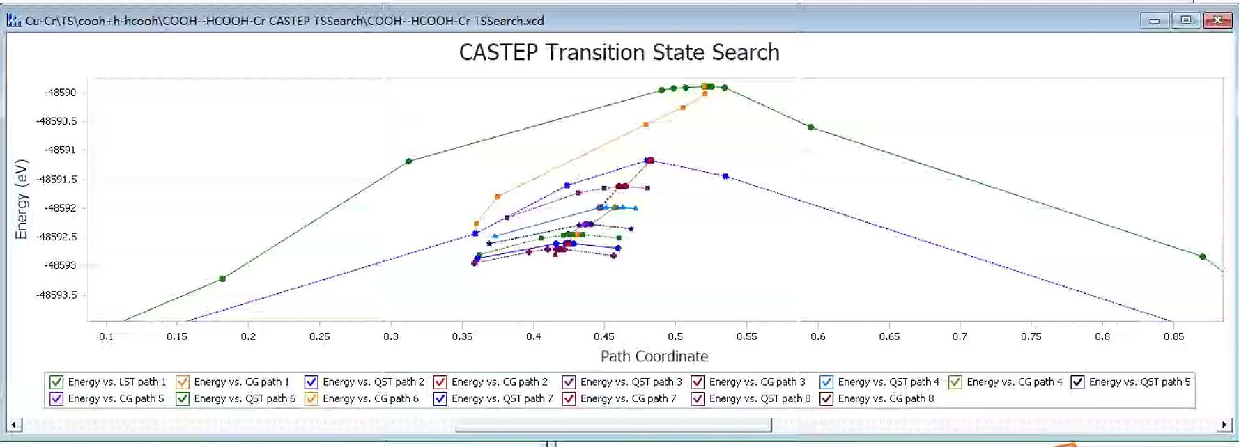 有大佬知道在castep模块计算过渡态搜索时为什么一直出现图片这种情况吗,并且到最后也会显示计算错误,但是下载下来后又没有给出报错原因。现在再算的是COOH+H到甲酸的过渡态搜索,计算参数设置都没有变,在纯铜上过渡态搜索可以计算成功,到这就一直无法计算成功,有大佬知道是什么原因吗 |