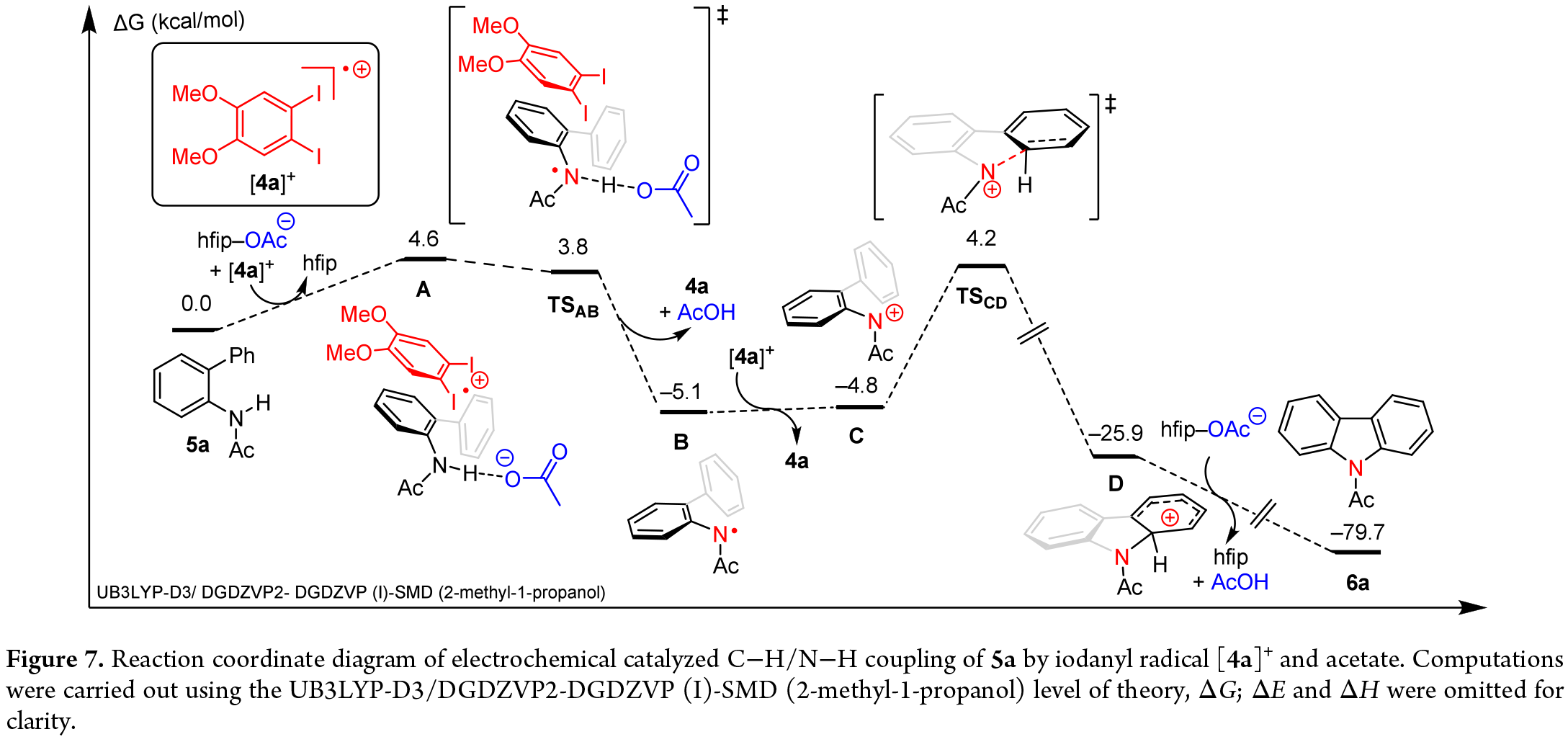高价碘试剂的实用性通常归因于其在底物氧化过程中通过选择性双电子氧化还原反应实现碘(i)、碘(iii)和碘(v)物种的相互转化。此前,作者报道了1,2-diiodoveratrole(4a)作为分子内氧化c╟h/n╟h偶联的高效催化剂,并提出其n╟h活化是通过iodanyl自由基(即碘(i)/碘(ii)催化循环)实现的,且无需形成相应的碘(iii)衍生物。但碘(ii)作为潜在的活性中间体,、在底物活化中的作用尚未得到充分研究。在此,得克萨斯农工大学(texas a&m university)david c. powers课题组和加州大学(university of california)osvaldo gutierrez团队合作报道了一项结合实验与计算的研究,探讨了iodanyl自由基催化下的n╟h活化和c╟n偶联反应。汇集的数据表明,阳极生成的iodanyl自由基通过多位点质子耦合电子转移(ms-pcet)机制直接促进c╟h/n╟h偶联反应,其中iodanyl自由基充当电子受体,而羧酸盐添加剂则作为质子受体。基于这些机理认识,开发出两种第二代催化剂——1-碘-4-甲氧基-2-(三氟甲基)苯(4c)和6,7-二碘-1,1,4,4-四甲基-1,2,3,4-四氢萘(4d)。这些催化剂展现出定制化的氧化还原特性,显著拓展了分子内与分子间无金属电催化c╟n键形成化学反应的应用范围。本文研究亮点: 1. 关键催化剂设计:基于ms-pcet机理,理性设计并开发了两种氧化性更强的第二代碘自由基催化剂4c与4d,其半波电位分别提升至1.58 v与1.75 v(vs. fc⁺/fc)。 2. 底物范围显著拓展:利用新催化剂4c,成功将分子内c-n偶联应用于传统催化剂4a难以转化的缺电子底物,如含酯基、氰基和硝基的衍生物,以最高92%的收率获得目标咔唑产物。 3. 实现挑战性分子间偶联:通过组合使用高氧化性催化剂4d与碱性更强的特戊酸盐,首次实现了碘自由基催化的分子间c-h胺化反应,以74%的收率成功构建c-n键,突破了该体系此前仅限于分子内反应的局限。 本文研究结果共同表明:(1)iodanyl自由基无需经由碘(iii)物种的中间体即可直接参与底物活化;(2)iodanyl自由基氧化还原性质的系统性变化为催化剂的合理优化提供了依据。实现单电子超价碘机理为合成提供了与经典双电子策略互补的机会,并推动了无金属电催化领域新型催化剂设计理念的发展。 图1. 高价碘反应性(图片来源:j. am. chem. soc.) 图2. iodanyl自由基化学总结(图片来源:j. am. chem. soc.) 图3. 电化学研究(图片来源:j. am. chem. soc.) 图4. 计算分析(图片来源:j. am. chem. soc.) 图5. 反应路径(图片来源:j. am. chem. soc.) 图6. ms-pcet机制和活化过程(图片来源:j. am. chem. soc.) 图7. 偶联反应的反应坐标图(图片来源:j. am. chem. soc.) 图8. cv曲线(图片来源:j. am. chem. soc.) 图9. uv-vis光谱(图片来源:j. am. chem. soc.) 图10. 底物范围(图片来源:j. am. chem. soc.) 论文信息 phong thai,# brandon l. frey,# remy f. lalisse, lauv patel, poulami mukherjee, zhihui song, raanan carmieli, osvaldo gutierrez,* david c. powers*. multisite proton-coupled electron transfer enables iodanyl radical catalysis. j. am. chem. soc., 2025, https://doi.org/10.1021/jacs.5c14648. |