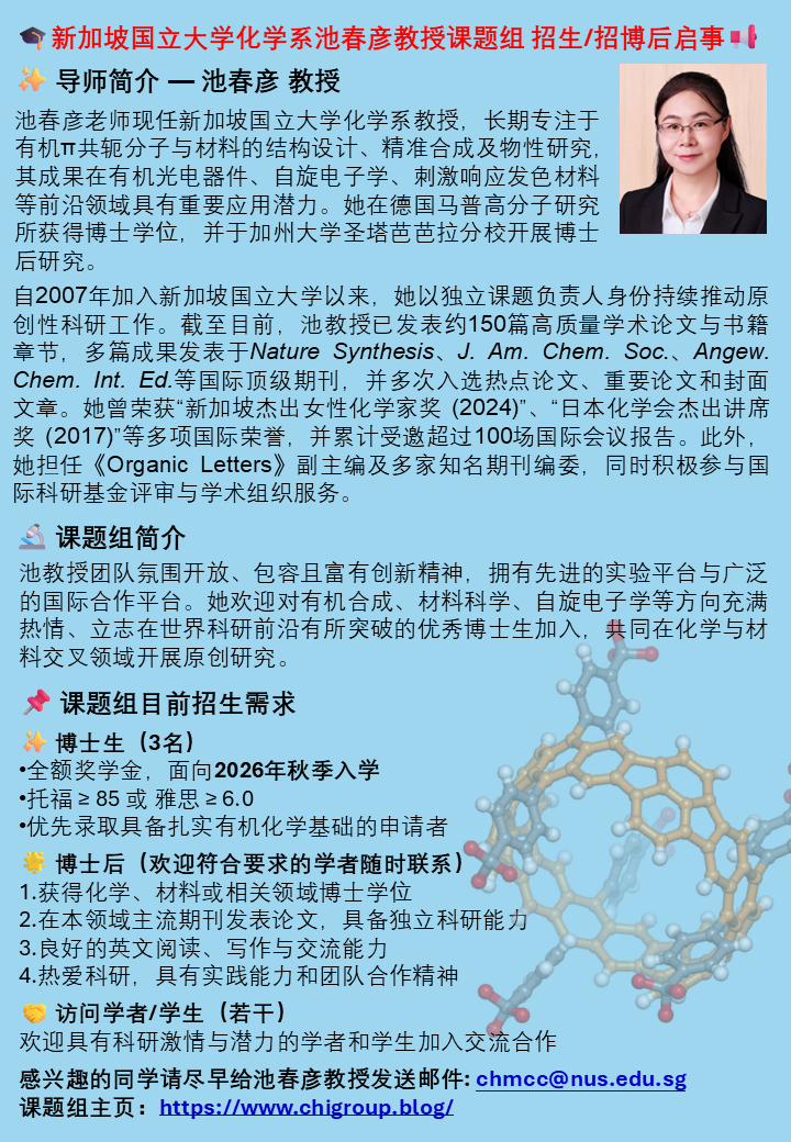 【导师简介 — 池春彦 教授】 池春彦老师现任新加坡国立大学化学系教授,长期专注于有机π共轭分子与材料的结构设计、精准合成及物性研究,其成果在有机光电器件、自旋电子学、刺激响应发色材料等前沿领域具有重要应用潜力。她在德国马普高分子研究所获得博士学位,并于加州大学圣塔芭芭拉分校开展博士后研究。 自2007年加入新加坡国立大学以来,她以独立课题负责人身份持续推动原创性科研工作。截至目前,池教授已发表约150篇高质量学术论文与书籍章节,多篇成果发表于Nature Synthesis、J. Am. Chem. Soc.、Angew. Chem. Int. Ed.等国际顶级期刊,并多次入选热点论文、重要论文和封面文章。她曾荣获“新加坡杰出女性化学家奖 (2024)”、“日本化学会杰出讲席奖 (2017)”等多项国际荣誉,并累计受邀超过100场国际会议报告。此外,她担任《Organic Letters》副主编及多家知名期刊编委,同时积极参与国际科研基金评审与学术组织服务。 【课题组简介】 池教授团队氛围开放、包容且富有创新精神,拥有先进的实验平台与广泛的国际合作平台。她欢迎对有机合成、材料科学、自旋电子学等方向充满热情、立志在世界科研前沿有所突破的优秀博士生加入,共同在化学与材料交叉领域开展原创研究。 【课题组目前招生需求】 博士生(3名) • 全额奖学金,面向2026年秋季入学 • 托福 ≥ 85 或 雅思 ≥ 6.0 • 优先录取具备扎实有机化学基础的申请者 博士后(欢迎符合要求的学者随时联系) 1. 获得化学、材料或相关领域博士学位 2. 在本领域主流期刊发表论文,具备独立科研能力 3. 良好的英文阅读、写作与交流能力 4. 热爱科研,具有实践能力和团队合作精神 访问学者/学生(若干) 欢迎具有科研激情与潜力的学者和学生加入交流合作 感兴趣的同学请尽早给池春彦教授发送邮件: chmcc@nus.edu.sg 课题组主页:https://www.chigroup.blog/ |