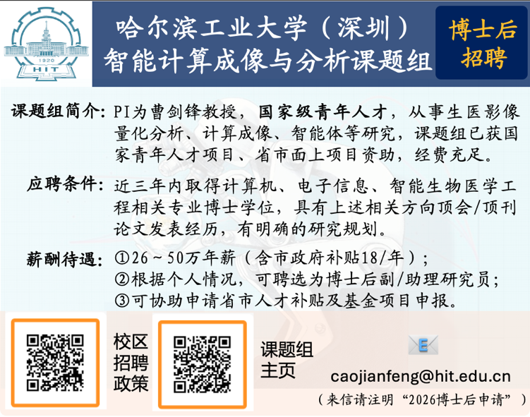 哈工深博士后/博士招收 哈尔滨工业大学(深圳) 智能计算成像与分析课题组 博士后/博士招收 课题组简介: PI 为曹剑锋教授,国家级青年人才,从事生医影像量化分析、计算成像、智能体等研究,课题组已获国家青年人才项目、省市面上项目资助,经费充足。 【博士后招收】 应聘条件: 近三年内取得计算机、电子信息、智能生物医学工程相关专业博士学位,具有上述相关方向顶会/顶刊论文发表经历,有明确的研究规划。 薪酬待遇: 26~50 万年薪(含市政府补贴 18 万/年); 根据个人情况,可聘选为博士后副/助理研究员; 可协助申请省市人才补贴及基金项目申报。 【博士招收】 申请条件: 计算机、电子信息、智能生物医学工程等相关学科背景,对生医影像、计算成像、智能体方向有研究兴趣,具备良好的科研潜力与英文读写能力。 培养支持: 参与课题组国家级/省部级项目,获得顶会/顶刊论文指导; 提供充足科研资源与生活补助,支持学术交流与合作; 优秀者可推荐参与国际合作项目,助力学术成长。 联系方式: 请将简历(博士后注明 “2026 博士后申请”,博士注明 “2026 博士申请”)发送至:caojianfeng@hit.edu.cn 发自小木虫IOS客户端 |