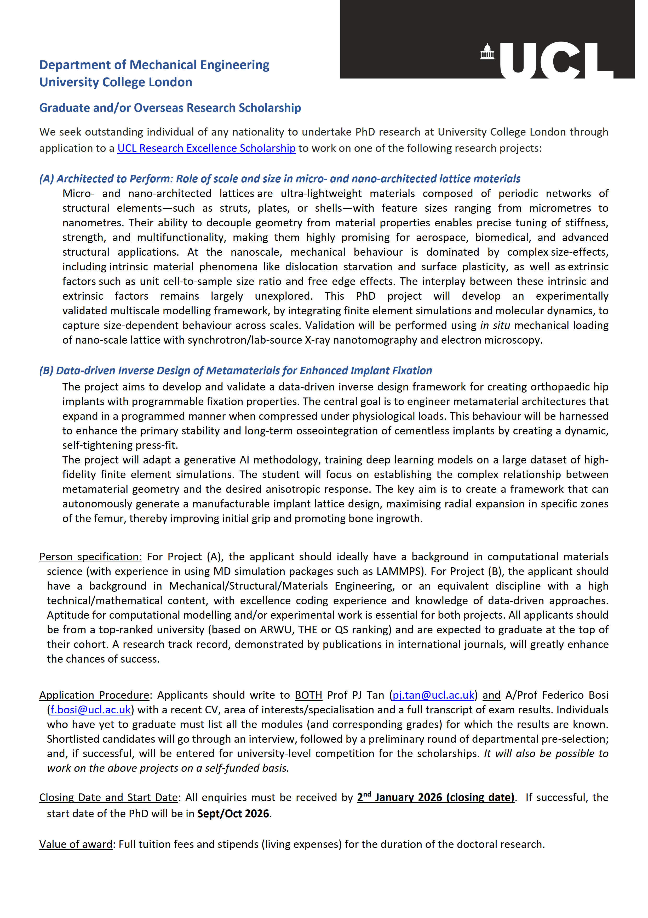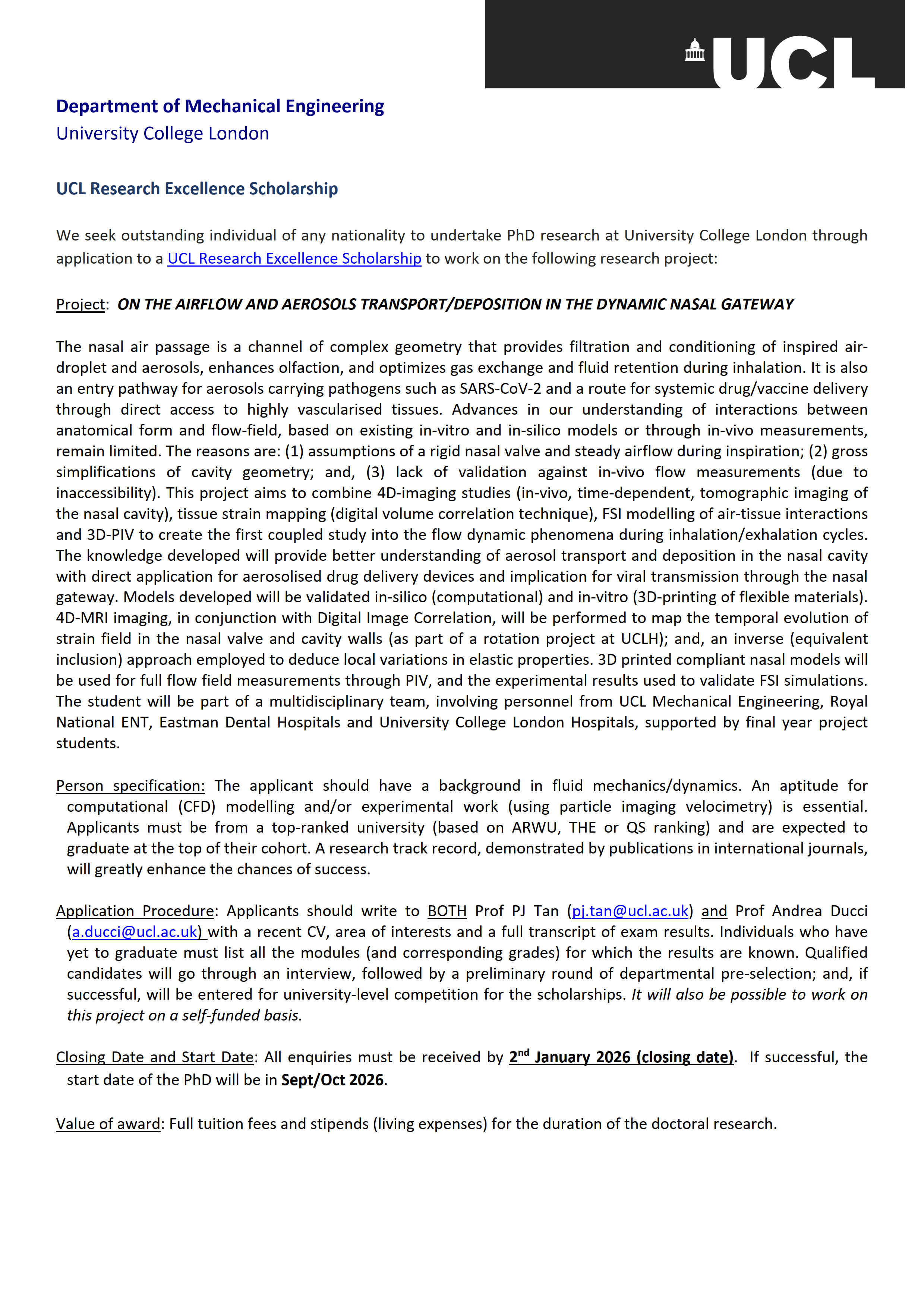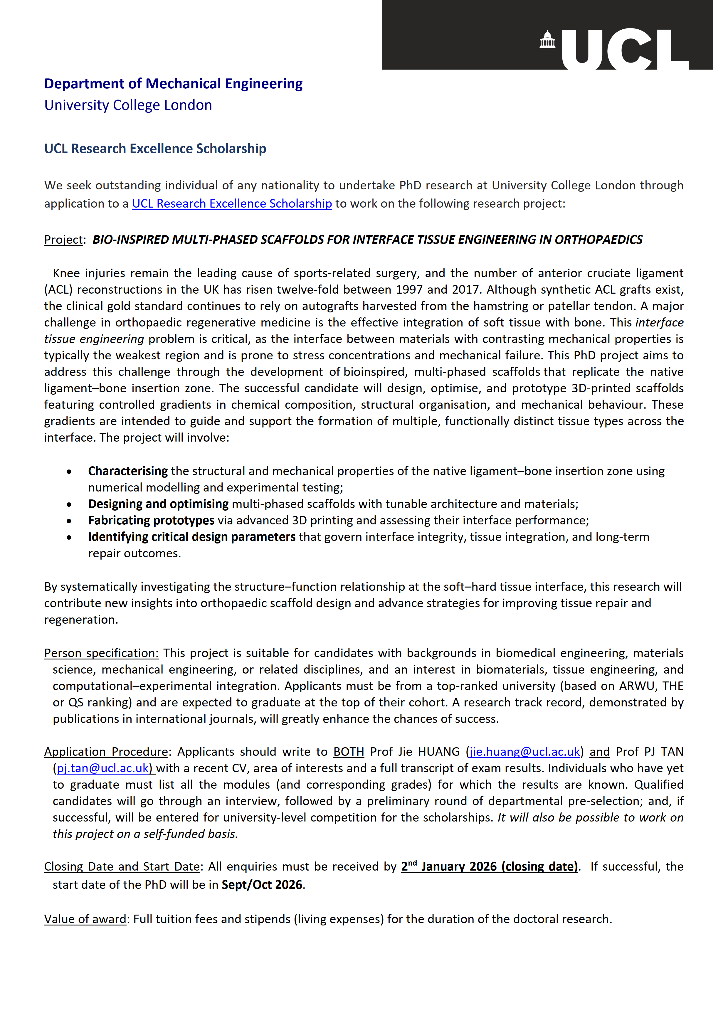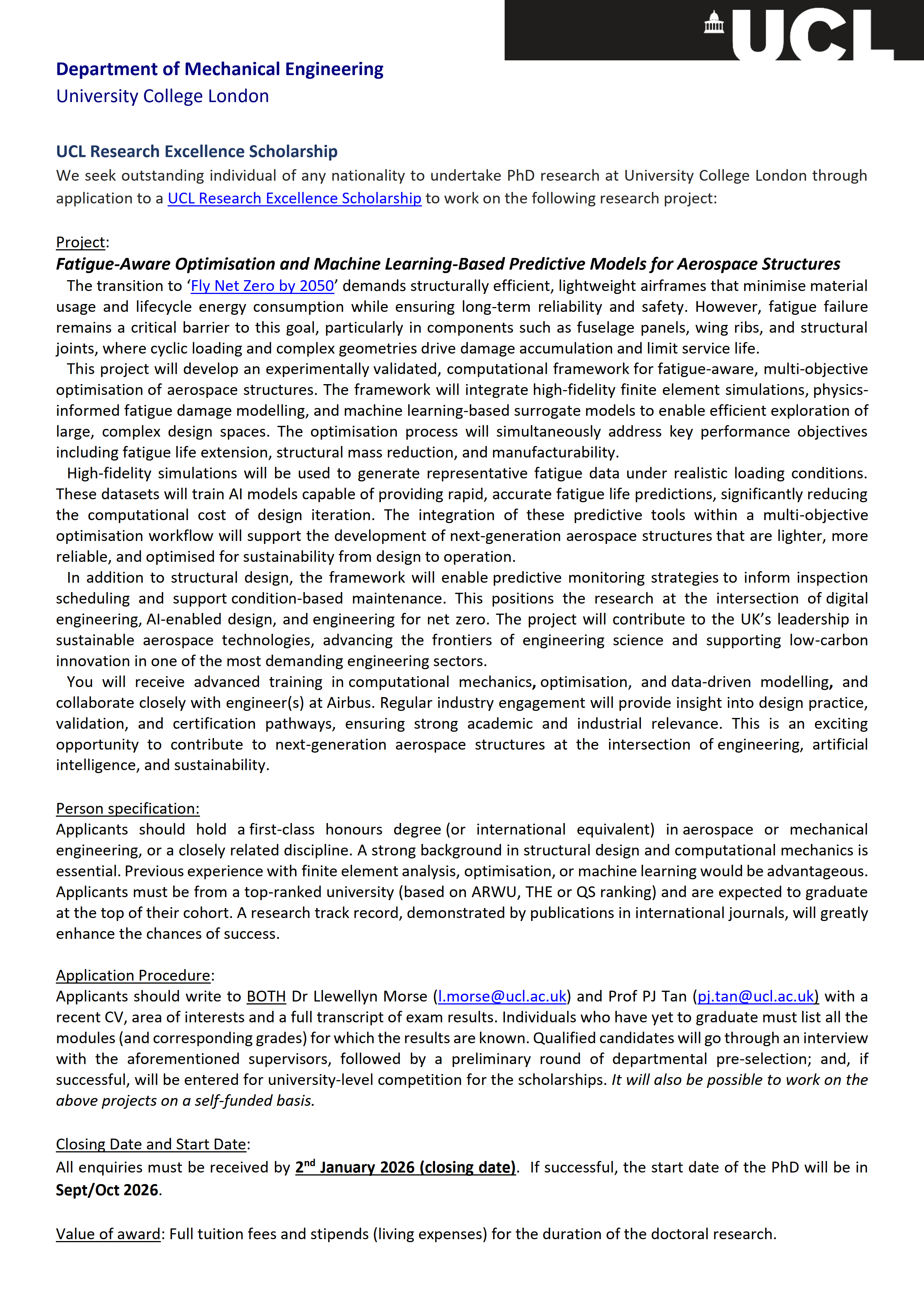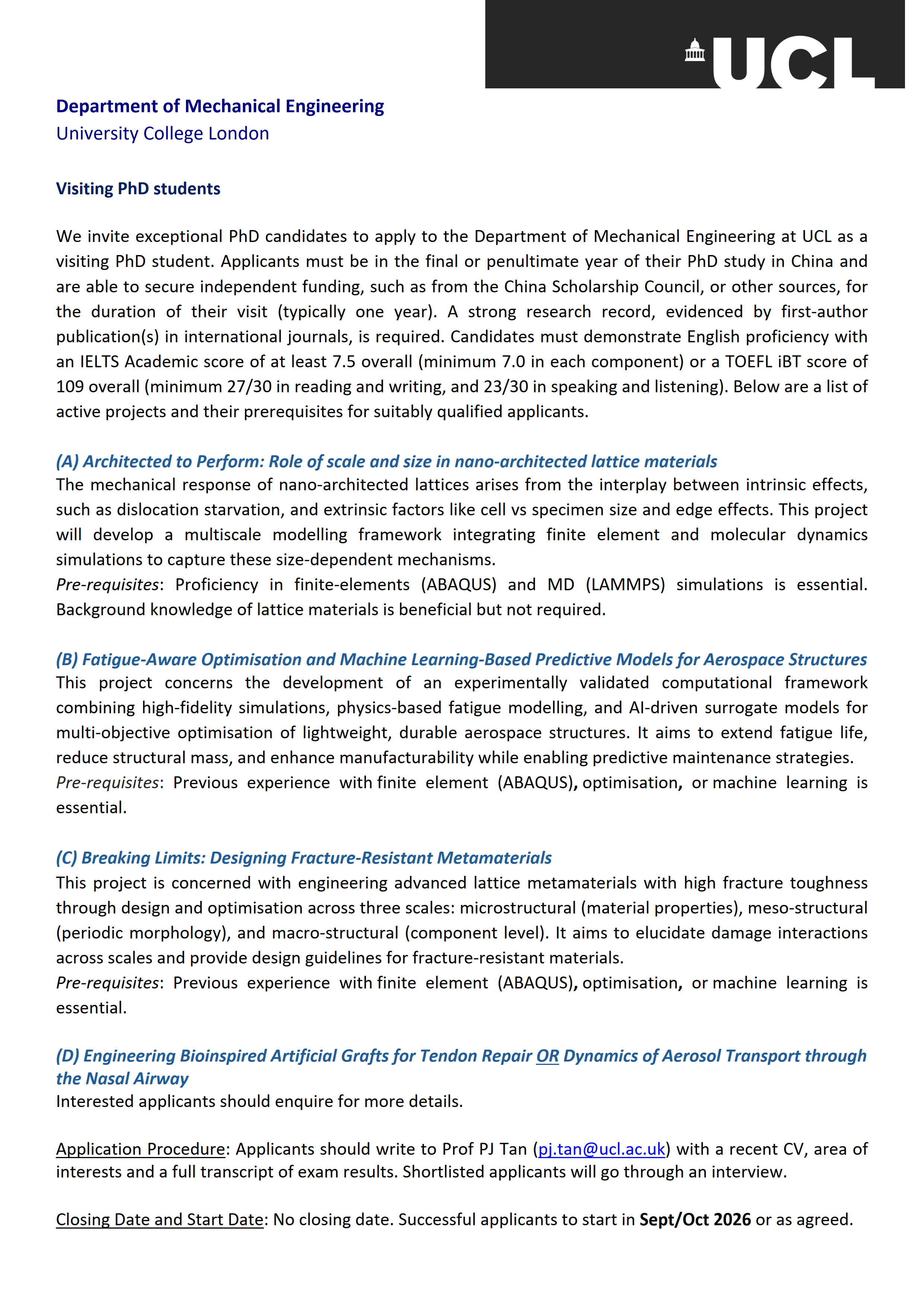 伦敦大学学院(University College London)机械工程系博士招生/CSC联培招生