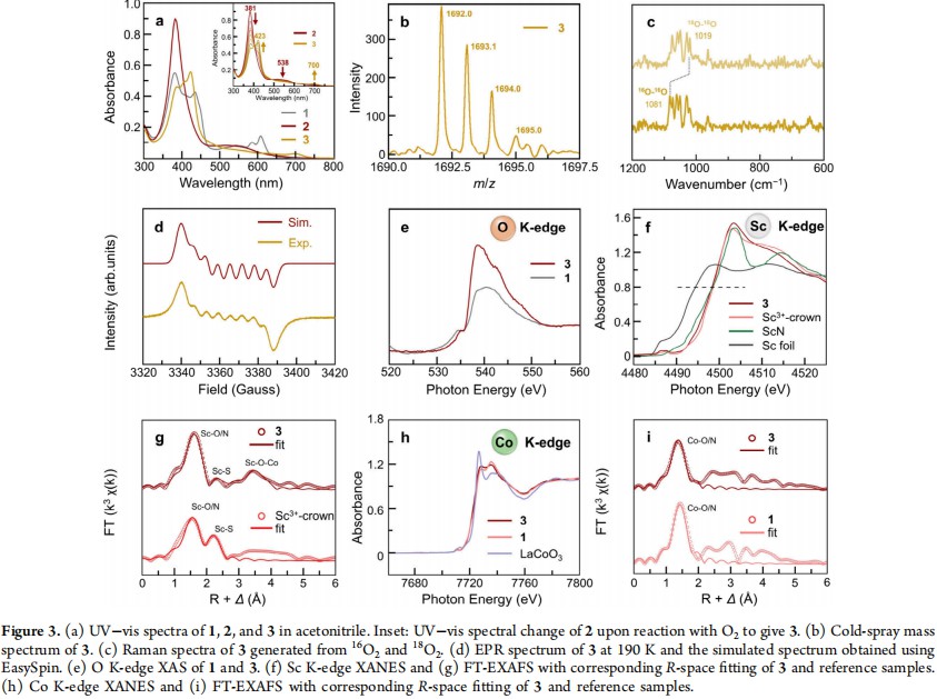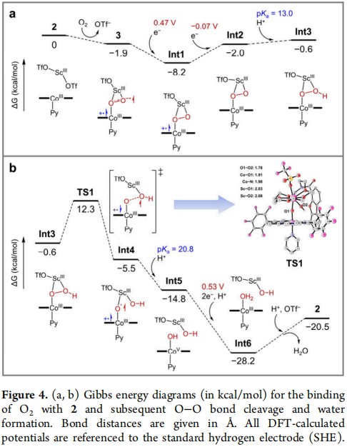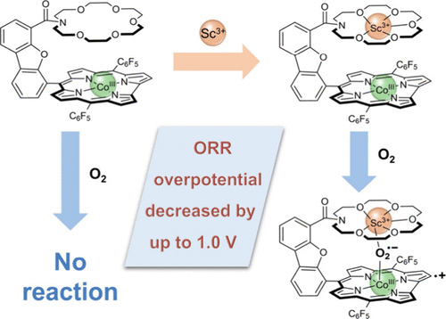 背景 氧还原反应是实现高效能源转换的关键步骤,其催化过程需在接近热力学平衡电位的条件下进行。目前,科研人员在开发低过电位、高活性的orr电催化剂方面已取得显著进展。然而,尽管已有多种高活性催化剂被成功开发,o₂的活化仍普遍依赖于在较高阴极电位下生成的低价金属离子,导致反应仍需在较大过电位下进行。因此,提高o₂在高价金属位点上的活化效率,成为提升orr电催化性能的核心挑战。 在众多催化剂中,钴基材料表现出优异的orr催化活性。通常,orr催化循环的开启依赖于co²⁺的参与。为增强o₂在钴位点上的结合与活化能力,研究领域已发展出多种策略,例如采用带负电的大环配体、引入正电性取代基以及利用氢键相互作用等。然而,由于三价钴具有较强的氧化性,其在o₂活化中的实际应用研究仍相对有限。作者致力于探索o₂在co³⁺位点上的活化路径,这有望显著降低电催化orr的过电位,从而实现低能耗催化o₂活化。 成果概述 本工作以含有第二配位层冠醚基团的钴咔咯为催化剂,系统探究了非氧化还原活性金属离子对电催化orr性能的影响。研究发现,sc³⁺对催化活性的提升最为显著,与无阳离子体系相比,orr的起峰电位正移了1 v。在sc³⁺存在条件下,三价钴咔咯能够直接活化氧气,生成coiii‑超氧‑sc³⁺咔咯阳离子自由基中间体,并利用紫外‑可见吸收光谱、电子顺磁共振谱、质谱、拉曼光谱及x-射线吸收光谱等多种手段对其结构进行了系统表征。理论计算进一步表明,sc³⁺在orr催化循环中促进了最初两个连续的电子转移步骤,并在热力学上有利于o-o键断裂,从而推动氧气经由4e⁻路径高效还原为水。该研究实现了基于+3价钴咔咯的氧气直接活化,揭示了sc³⁺在稳定coiii‑超氧化物中间体及促进orr反应中的关键作用。 图文解析 图一,(a)4电子orr的氧化还原电位及coⅢ/Ⅱ电位。(b)分子1的单晶结构及sc³⁺存在下与o₂的反应。 图二,(a)化合物1和2在氩气饱和乙腈中中的cv。(b)在o₂和h₂o(10%)存在的条件下,1和m-hung 1在乙腈中的lsvs。(c)在乙腈中的rrde数据和(d)分子2电催化orr的n值。(e)在0.5 m h₂so₄溶液中的rrde数据和(f)分子2电催化orr的n值。(g)在0.5 m h₂so₄溶液中的电催化orr活性比较(红色,分子催化剂;灰色,材料催化剂)。 图三,(a)1,2和3在乙腈中的uv-vis光谱。插图:2与o₂反应为3的uv-vis光谱变化。(b)3的冷喷雾质谱图。(c)在¹⁶o₂和¹⁸o₂氛围下生成3的拉曼光谱。(d)化合物3在190 k下的epr实验谱与easyspin模拟谱。(e)1和3的o k-边xas。(f)sc的k-边xanes。(g)分子3和对照样品sc的r空间ft-exafs拟合图。(h)co的k-边xanes。(i)分子3和对照样品co的r空间ft-exafs拟合图。 图四,(a, b)2结合o₂以及随后o-o键断裂和水的生成的吉布斯自由能图(kcal/mol)。键距单位为Å,所有dft计算的电位均相对于标准氢电极(she)。 总结 本工作基于co³⁺位点对o₂的活化作用,成功实现了对电催化orr性能的提升。通过在第二配位层引入sc³⁺,所构建的co³⁺咔咯催化剂在水相和非水相介质中均展现出高效、高选择性的四电子orr路径。与化合物1相比,引入sc³⁺的co³⁺咔咯在乙腈溶液中orr过电位降低了1.0 v,在h₂so₄溶液中降低了170 mv。尤其在酸性条件下,该催化剂的orr性能优于目前所有已报道的钴基电催化剂。实验与理论研究表明,sc³⁺离子通过其电子的“拉效应”,有效促进了o₂的结合与o-o键的断裂。本工作一方面展示了第二配位层含sc³⁺的钴咔咯作为一种优异的分子电催化剂;另一方面,揭示了非氧化还原活性的路易斯酸性金属离子在促进高价金属活化o₂过程中的关键作用。 鸣谢 感谢曹睿老师对整个工作方向的付出与指导,感谢曹宇辰老师和廖荣臻老师对理论计算的指导,感谢龙冉老师和张林娟老师在x射线吸收精细结构表征实验上的指导,感谢郑彦瑧老师和罗前程老师在电子顺磁共振表征实验上的指导,感谢国家自然科学基金、霍英东青年教师基金、中央高校基础研究基金和陕西师范大学的支持。 论文信息 promoted o₂ activation at a coiii center for significantly improved electrocatalytic oxygen reduction reaction https://pubs.acs.org/10.1021/jacs.5c14593 doi:10.1021/jacs.5c14593 |