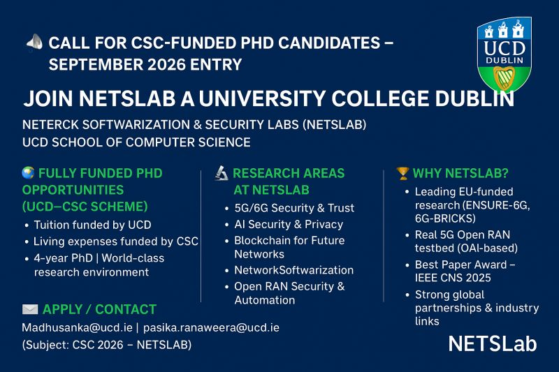 CSC²©Ê¿ÕÐÉú£ü°®¶ûÀ¼¶¼°ØÁÖ´óѧUCD NETSLab£ü2026Äê9ÔÂÈëѧ