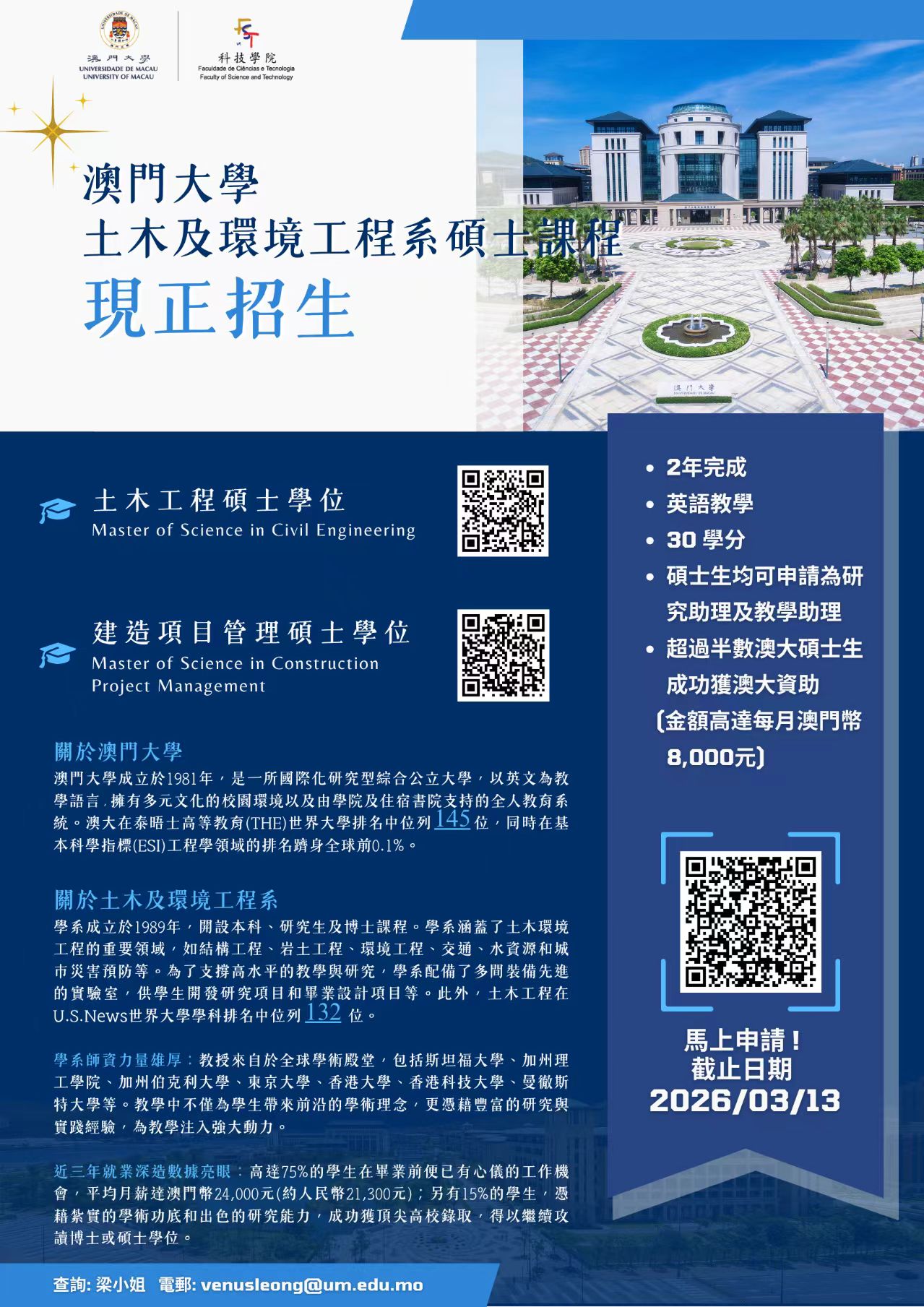 作為C9+大學的澳門大學,其土木工程學科在U.S.News世界大學學科排名中位列132 位。這裏彙聚全球頂尖師資,擁有世界一流的教學設施和科研平臺,致力於培養行業領袖與創新者。 我們提供: •豐厚資助:超過半數碩士生獲獎學金或助教/研究助理資助,最高8,000澳門元/月,輕鬆覆蓋學費與生活費。 •就業保障:近三年75%學生畢業前斬獲高薪offer,15%學生直通全球頂尖名校! •薪資領先:畢業生平均起薪約24,000澳門元/月,遠超多數學科! 申請截止:2026年3月13日(名額有限,滾動錄取,先到先審) 即刻申請,搶佔2026入學席位! 詳情諮詢:梁女士venusleong@um.edu.mo 加入澳門大學土木及環境工程系,開啟你的卓越職業生涯! |