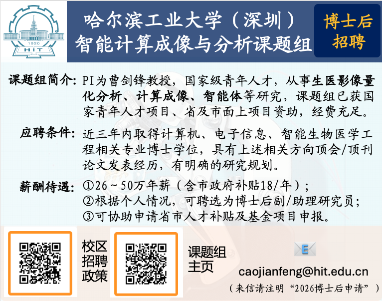 智能显微成像与分析课题组 【课题组简介】: PI 为曹剑锋教授,从事生医影像量化分析、计算成像、智能体等研究,课题组已获国家青年人才项目、省市面上项目资助,经费充足。 【博士后招收】 —应聘条件: 近三年内取得计算机、电子信息、智能生物医学工程相关专业博士学位,具有上述相关方向顶会/顶刊论文发表经历,有明确的研究规划。 —薪酬待遇: 26~50 万年薪(含市政府补贴 18 万/年); 根据个人情况,可聘选为博士后副/助理研究员; 可协助申请省市人才补贴及基金项目申报。 【2026秋季博士招收】 —申请条件: 计算机、电子信息、智能生物医学工程等相关学科背景,对生医影像、计算成像、智能体方向有研究兴趣,具备良好的科研潜力与英文读写能力。 —培养支持: 参与课题组国家级/省部级项目,获得顶会/顶刊论文指导; 提供充足科研资源与生活补助,支持学术交流与合作; 优秀者可推荐参与国际合作项目,助力学术成长。 》〉》联系方式: 请将简历发送至:caojianfeng@hit.edu.cn (博士后注明 “2026 博士后申请”,博士注明 “2026 博士申请”) |