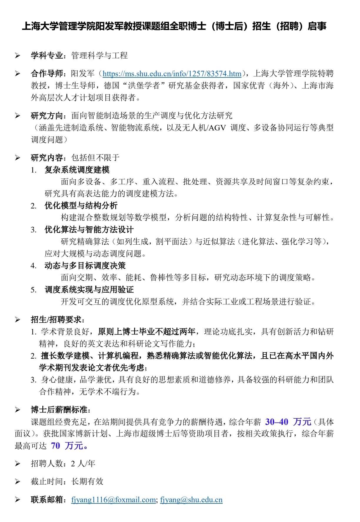 上海大学管理学院阳发军教授课题组全职博士/博士后招聘启事