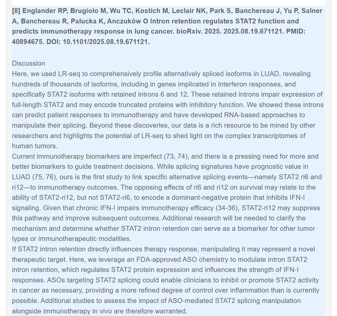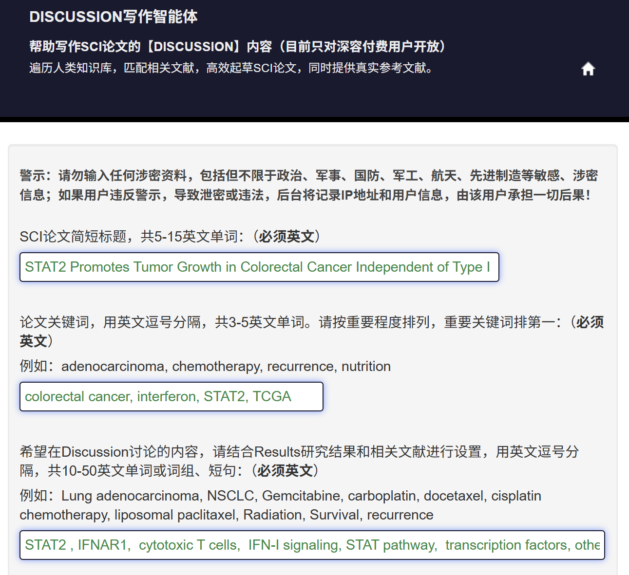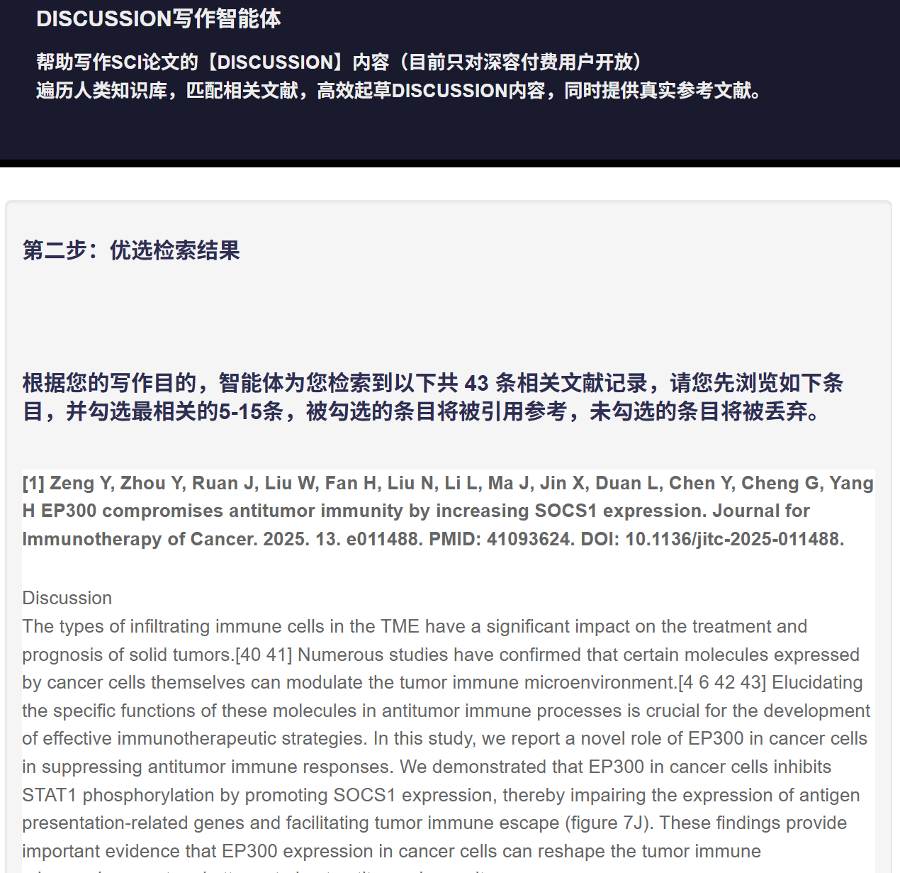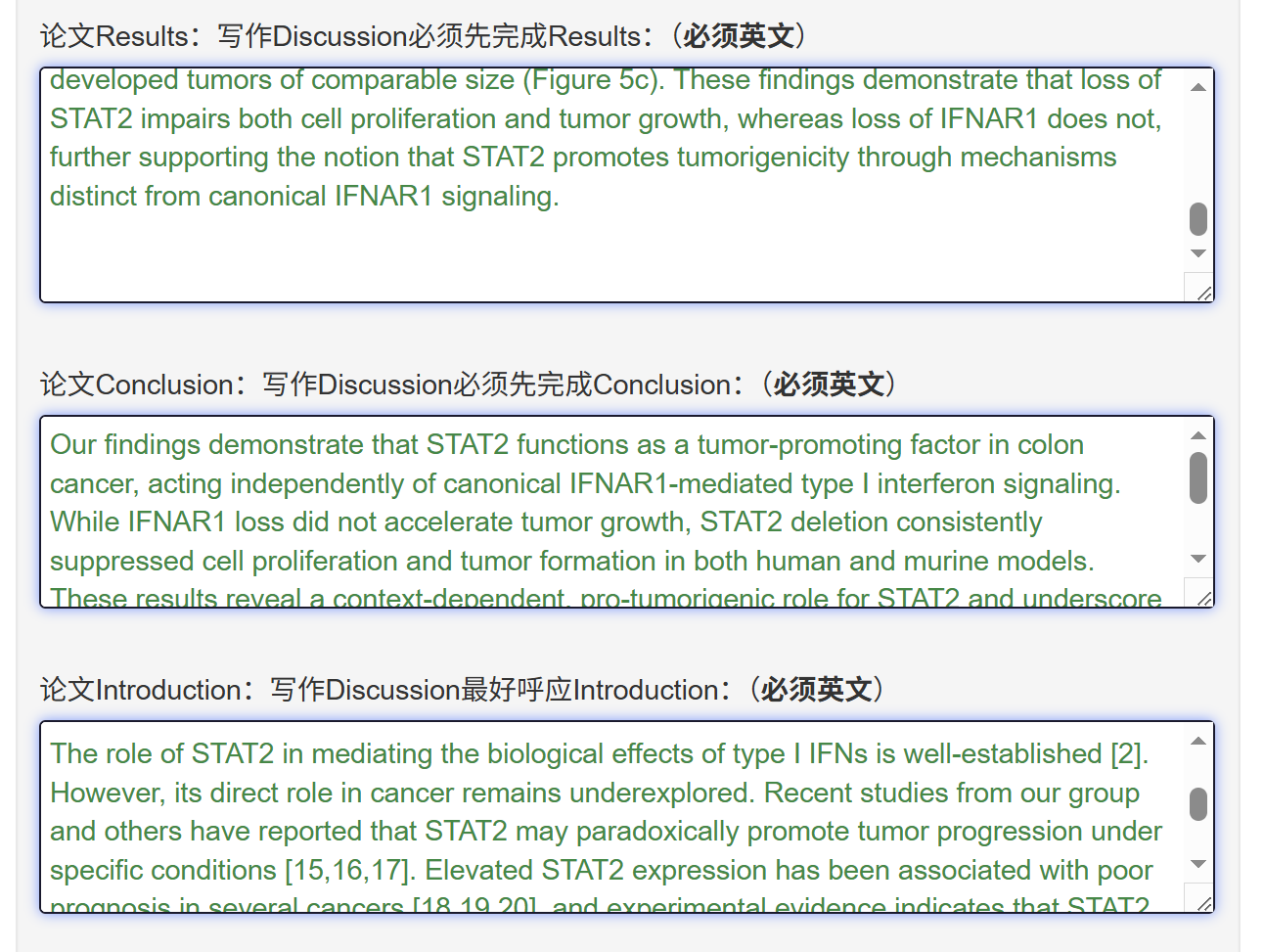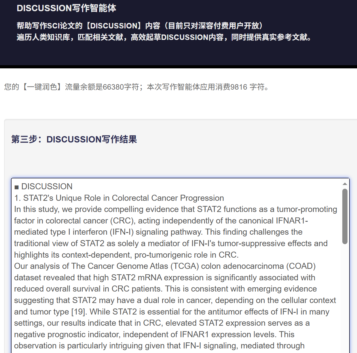 如需试用【深容SCI写作智能体】,请联系张老师:shenrongagent [https://scioriginal.com] 很多作者一直认为Discussion是SCI论文最难写的内容,既要充分讨论Results的数据,又要结合外部文献深入探究,还要回应Introduction中提出的问题,确实很烧脑。 ![]() 但现在Discussion不难了,智能体帮您高质量起草。输入:Title/ Keywords/ Introduction/ Results/ Conclusion; 输出:Discussion。5分钟完成Discussion起草,并附真实参考文献。Discussion智能体的写作质量堪比985博士生! 让我们以一篇文章(STAT2 Promotes Tumor Growth in Colorectal Cancer Independent of Type I IFN Receptor Signaling)来测试一下Discussion智能体。 如上图,输入:Title/ Keywords/ Introduction/ Results/ Conclusion; 等待片刻,智能体在数据库中成功检索到43篇相关文献,并提取其全文。这一步需要您人工优选检索结果,后续的写作正是基于您勾选的参考文献。 激动人心的时刻到了!智能体已经成功输出Discussion,写作质量太哇塞了! 以下是Discussion全文,欢迎研究结直肠癌的同道评价一下写作质量,包括验证参考文献: ■ DISCUSSION 1. STAT2's Unique Role in Colorectal Cancer Progression In this study, we provide compelling evidence that STAT2 functions as a tumor-promoting factor in colorectal cancer (CRC), acting independently of the canonical IFNAR1-mediated type I interferon (IFN-I) signaling pathway. This finding challenges the traditional view of STAT2 as solely a mediator of IFN-I's tumor-suppressive effects and highlights its context-dependent, pro-tumorigenic role in CRC. Our analysis of The Cancer Genome Atlas (TCGA) colon adenocarcinoma (COAD) dataset revealed that high STAT2 mRNA expression is significantly associated with reduced overall survival in CRC patients. This is consistent with emerging evidence suggesting that STAT2 may have a dual role in cancer, depending on the cellular context and tumor type [19]. While STAT2 is essential for the antitumor effects of IFN-I in many settings, our results indicate that in CRC, elevated STAT2 expression serves as a negative prognostic indicator, independent of IFNAR1 expression levels. This observation is particularly intriguing given that IFN-I signaling, mediated through IFNAR1, is generally considered tumor-suppressive in CRC and other malignancies [19]. The discrepancy between STAT2's role in mediating IFN-I's antitumor effects and its tumor-promoting function in CRC underscores the complexity of the STAT signaling network. STAT proteins, including STAT2, are known to form homo- and heterodimers, and their interactions with other transcription factors can lead to diverse downstream effects [19]. In CRC, it is possible that STAT2 forms alternative complexes or interacts with different co-factors, leading to the activation of pro-tumorigenic gene programs. This hypothesis is supported by our functional studies, which demonstrated that STAT2 deletion suppresses tumor cell proliferation and tumor growth in both human and murine models, while IFNAR1 deletion does not have the same inhibitory effect. 2. Distinct Signaling Pathways Regulated by STAT2 and IFNAR1 Our investigation into the downstream signaling consequences of STAT2 and IFNAR1 deletion revealed distinct patterns of STAT activation. In human HCT116 cells, STAT2 deletion led to reduced phosphorylation of STAT1 and enhanced phosphorylation of STAT3, whereas IFNAR1 deletion impaired the activation of all three STATs (STAT1, STAT2, and STAT3). This suggests that STAT2 plays a unique role in modulating the balance between STAT1 and STAT3 signaling, which may have implications for tumor progression. STAT1 is generally considered tumor-suppressive, promoting antiproliferative and pro-apoptotic responses, while STAT3 is often associated with pro-tumorigenic effects, supporting cell survival, proliferation, and angiogenesis [21]. The paradoxical preservation of STAT3 signaling in STAT2 KO cells may provide a mechanistic explanation for the tumor-promoting role of STAT2 in CRC. Enhanced STAT3 activity could drive the expression of genes involved in cell cycle progression, survival, and metastasis, thereby promoting tumor growth. Conversely, the impaired STAT1 activation in STAT2 KO cells may reduce the expression of tumor-suppressive genes, further contributing to the pro-tumorigenic phenotype. These findings align with previous studies showing that dysregulated STAT3 signaling is a common feature of many cancers, including CRC, and is associated with poor prognosis [19]. In murine MC38 colon carcinoma cells, we observed a similar pattern of altered STAT activation upon STAT2 and IFNAR1 deletion. STAT1 activation was completely absent in STAT2 KO cells, and STAT3 phosphorylation was reduced compared to parental cells. These results suggest that the distinct roles of STAT2 and IFNAR1 in regulating downstream STAT signaling are conserved across species, reinforcing the relevance of our findings to human CRC. 3. Impact on Cytotoxic T Cells and the Tumor Microenvironment The tumor microenvironment (TME) plays a critical role in CRC progression, and immune cells, particularly cytotoxic T lymphocytes (CTLs), are key mediators of antitumor immunity [4]. IFN-I signaling is known to enhance the cytotoxic activity of CTLs and natural killer (NK) cells, contributing to tumor suppression [4]. However, our results indicate that STAT2's tumor-promoting effects in CRC are independent of canonical IFNAR1-mediated IFN-I signaling, suggesting that STAT2 may influence the TME through alternative mechanisms. One possibility is that STAT2 modulates the expression of immune checkpoint molecules or cytokines that affect CTL infiltration and function. For example, STAT2 could promote the production of immunosuppressive cytokines, such as transforming growth factor-beta (TGF-beta) or interleukin-10 (IL-10), which inhibit CTL activity and promote tumor immune evasion 