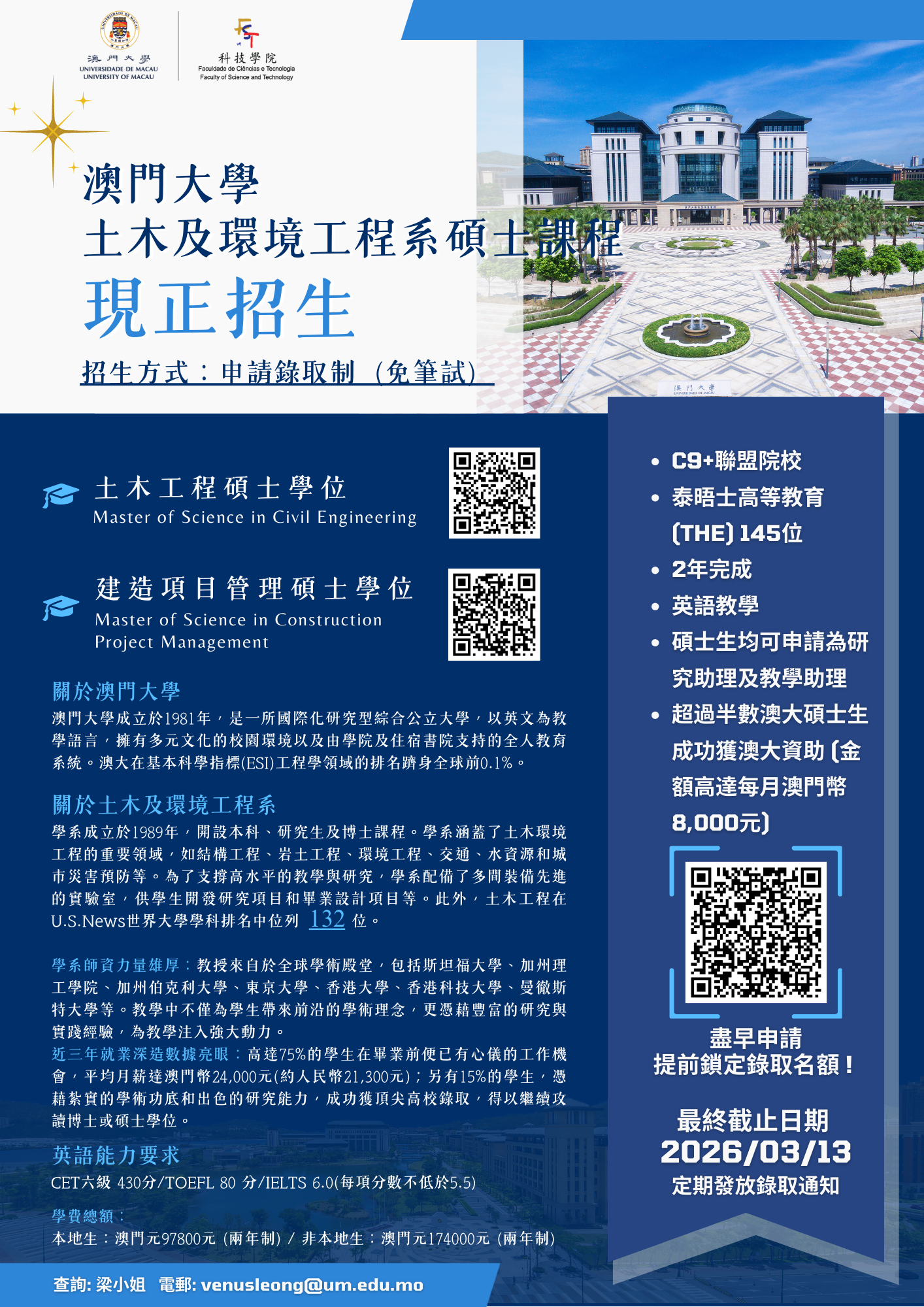 澳门大学土木工程硕士和建造项目管理硕士2026Fall入学通道正式开放!